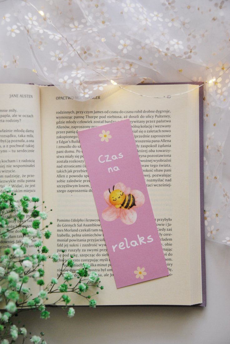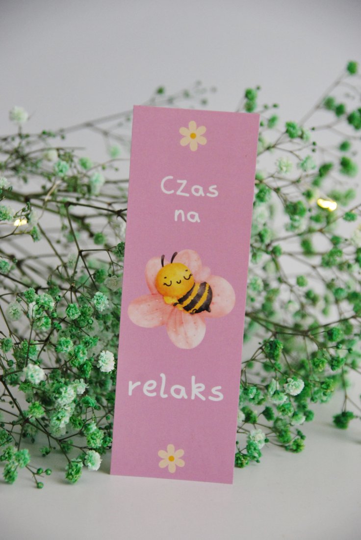 Papierowa zakładka do książki z oryginalnym motywem - przedstawia pszczółkę i napis Czas na relaks.