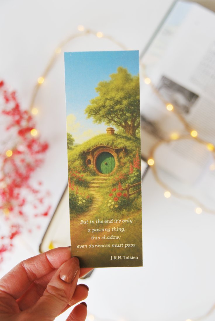 Ta elegancka papierowa zakładka inspirowana Władcą Pierścieni to idealny dodatek dla miłośników twórczości Tolkiena. Na jednej stronie znajduje się minimalistyczna grafika z kultowym Jedynym Pierścieniem oraz klasycznym tytułem sagi, a na drugiej – nastrojowa ilustracja urokliwego Shire wraz z motywującym cytatem: