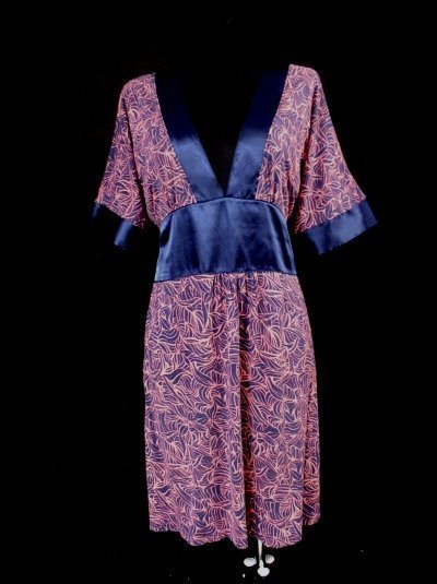 Sukienka firmy paprika.Rozmiar L.Materiał 95% wiskoza + 5% elastan.Z przodu w pasie wstawka z granatowego materiału z lekkim połyskiem.Po bokach wszyte szarfy do wiązania z tyłu.Dekolt i rękawy,obszyte granatową plisą.Rękaw kimono.Z przodu na środku małe marszczenie.Stan bardzo dobry-.Długość 99 cm.pas 93 cm.