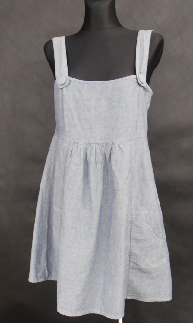 Sukienka firmy paprika.Zapinana na szelkach 3,5 cm. na duże guziki,obciągnięte materiałem.Zapinana z boku na zamek.Odcięta w pasie.Dół marszczony na środku w dole dwie kieszenie.Stan bardzo dobry-.Długość 87 cm.pod pachami 88 cm.pas 84 cm.Rozmiar S.Materiał bawełna.