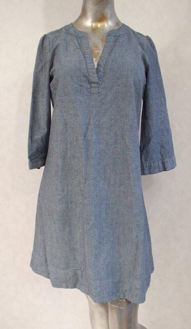 Sukienka firmy paprika.Rozmiar S.Materiał bawełna.W koło szyi stójka,rozcięcie na środku.Z tyłu na środku marszczenie gumką.Rękaw 3/4,zakończony mankietem zapiętym na guzik.Stan bardzo dobry-ogólnie.Długość 87 cm.pod pachami 102 cm.Kolor szaro-niebieski.