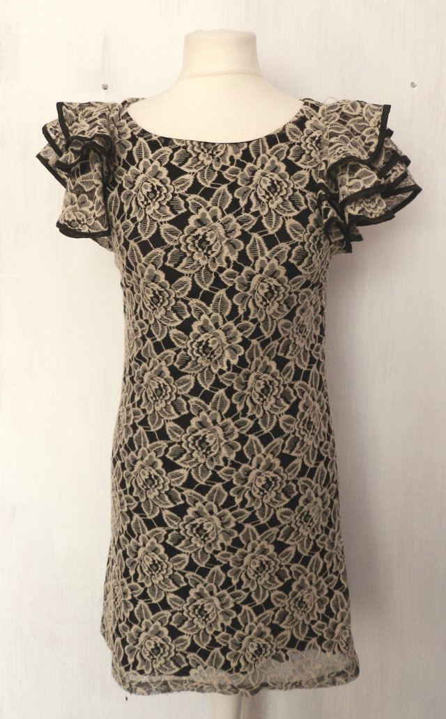 Koronka w odcieniu jasnego, rozmytego brązu/żółtego i czerni na czarnej podszewce