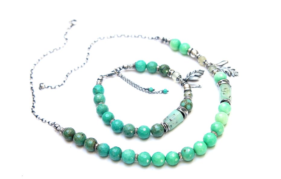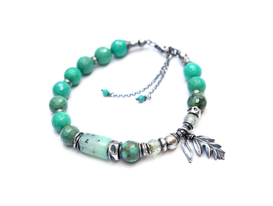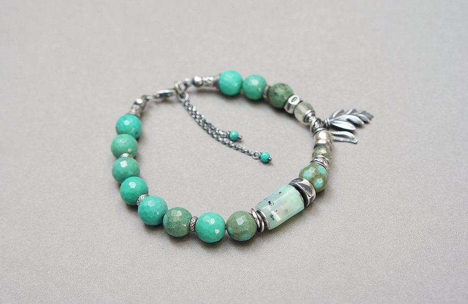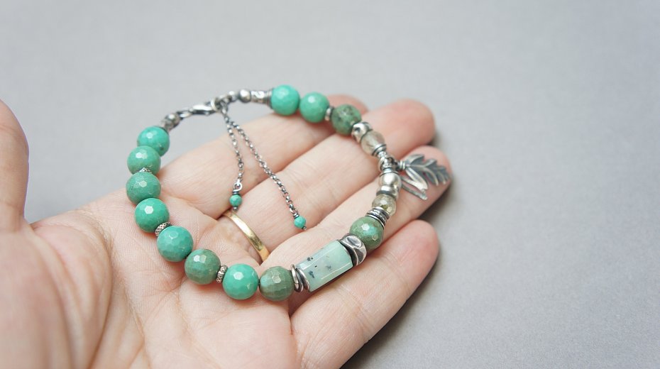Bransoletka wykonana ze srebra [pr. 925] w połączeniu z minerałami: fasetowane kuleczki chryzoprazu [8mm], fasetowane kuleczki frenitu [6mm], nieforemnym wałeczkiem chryzoprazu [12mm], fasetowanymi turkusami [2mm] oraz srebrnych przekładek i zawieszek. Całość oksydowana i przetarta. Całkowita długość bransoletki 19cm plus ozdobna przedłużka. Biżuteria ozdobnie zapakowana .