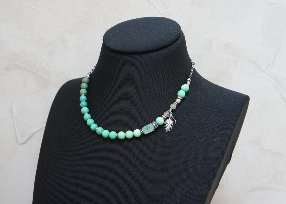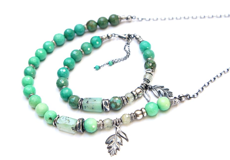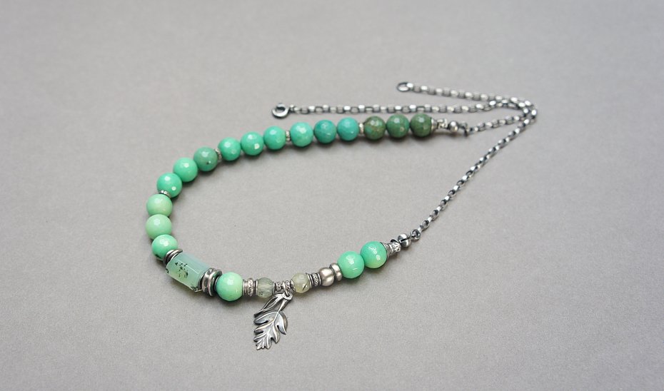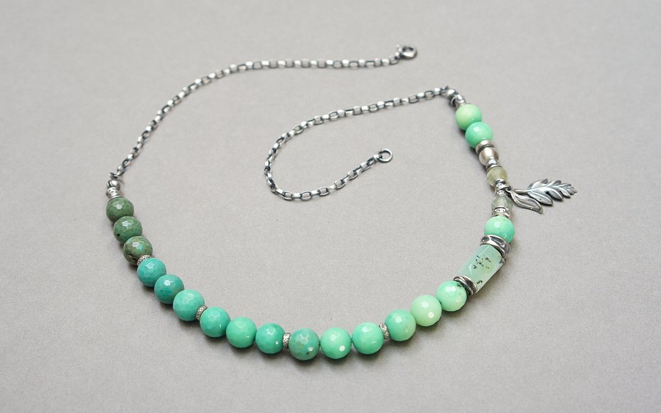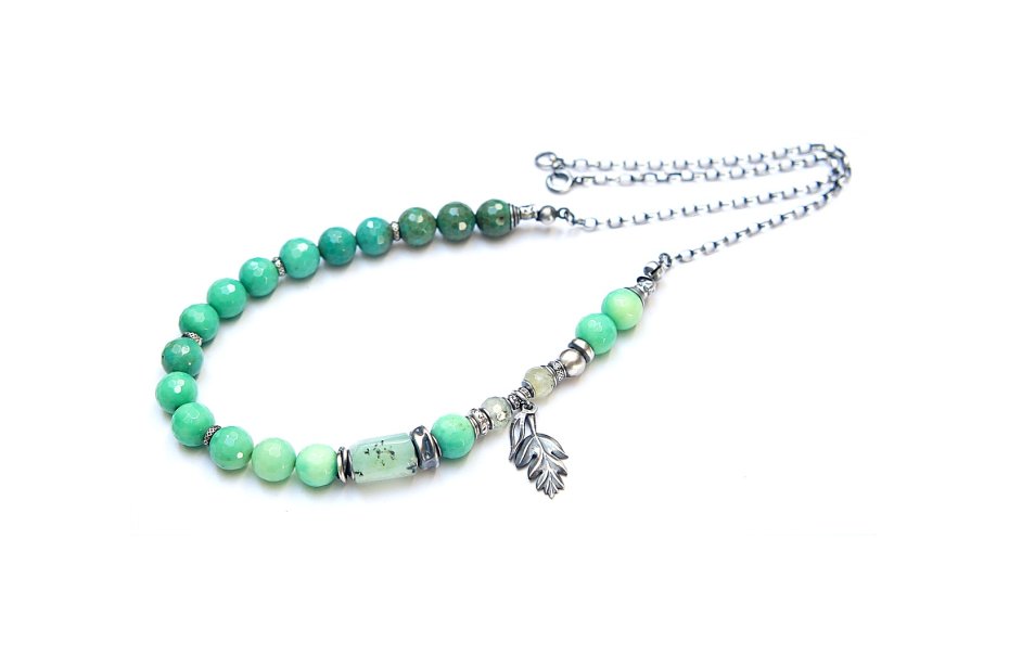 Naszyjnik wykonany ze srebra [pr. 925] w połączeniu z fasetowanymi kuleczkami chryzoprazu [8mm], fasetowanymi kuleczkami frenitu [6mm] ,nieforemnym wałeczkiem chryzoprazu [12mm] oraz srebrnymi przekładkami i zawieszkami . Całość oksydowana i przetarta. Całkowita długość naszyjnika 49. Biżuteria ozdobnie zapakowana .