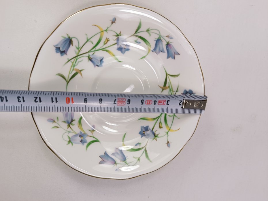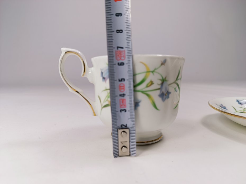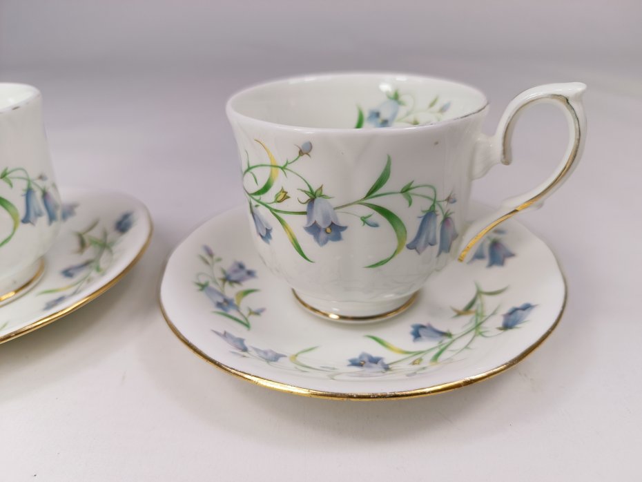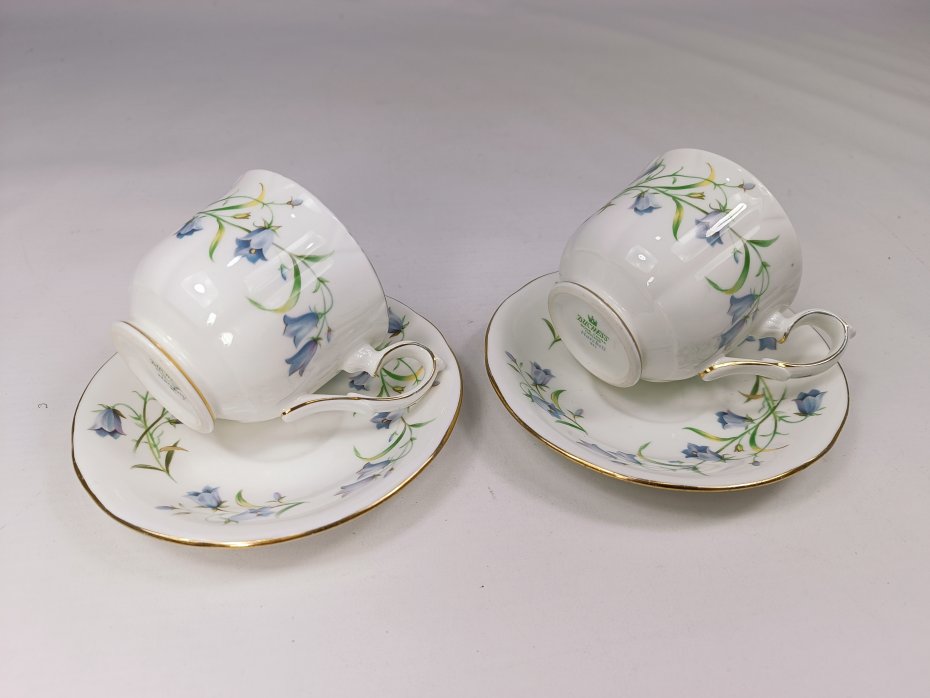 Para filiżanek z angielskiej porcelany kostnej Duchess, wzór Harebell. Naczynia są zdobione motywem dzwonków okrągłolistnych (harebells) w kolorze niebieskim oraz złoceniami. Na złoceniach występują przytarcia głównie na rancie filiżanek - widoczne na zdjęciach. Poza tym stan filiżanek jest bardzo dobry porcelana zachowana bez uszkodzeń.
