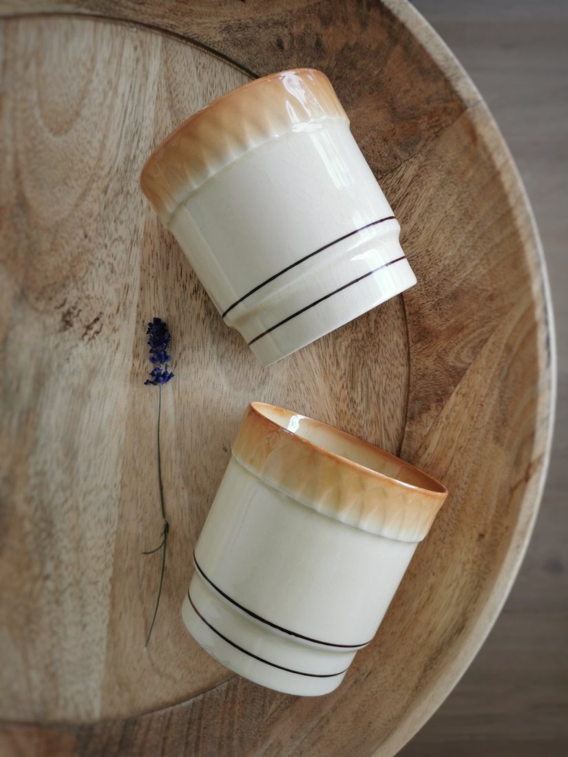 Wykonane z porcelitu, szkliwione na kolor ecru z ozdobnymi paseczkami malowanymi ręcznie przy podstawie.