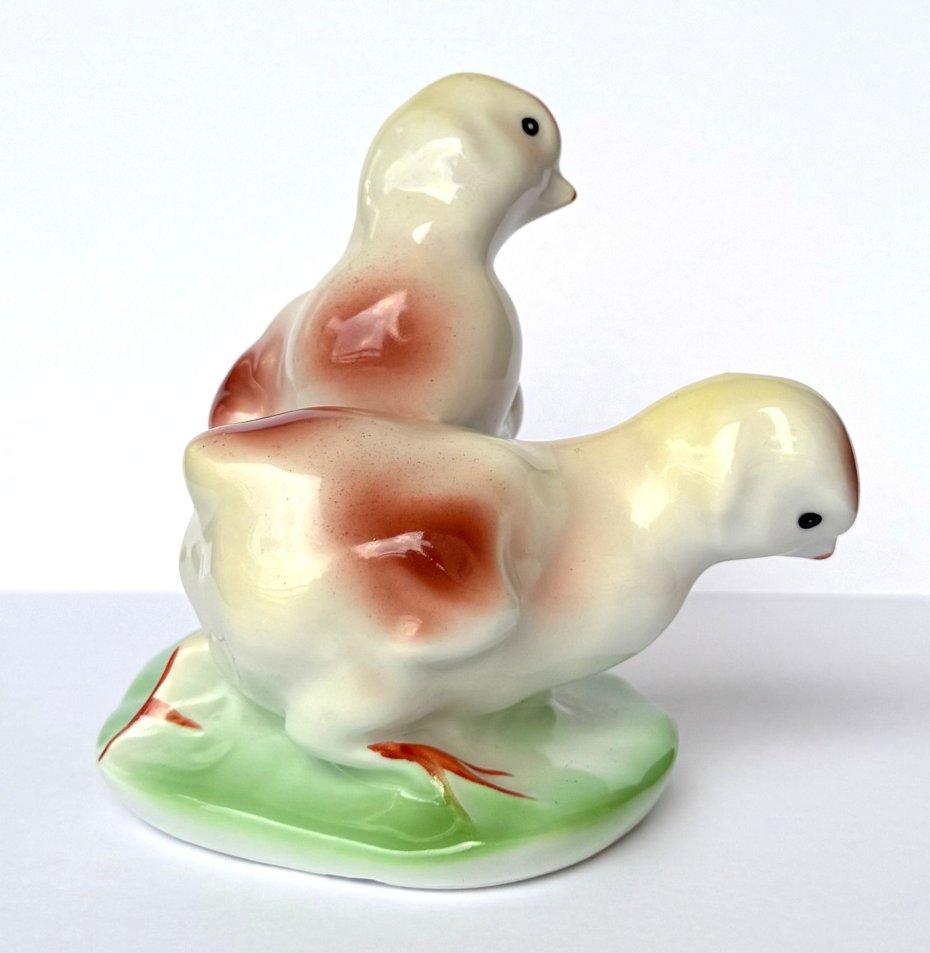 Przedstawiam uroczą pamiątkę z minionej epoki w postaci porcelanowej figurki dwóch piskląt, wyprodukowaną przez cenioną rumuńską manufakturę Curtea de Argeș. Ten kolekcjonerski przedmiot, pochodzący z okresu PRL, wyróżnia się typowym dla tamtych lat rzemiosłem i estetyką vintage. Figurka została ozdobiona ręcznie przy użyciu metody natryskowej, co pozwoliło uzyskać miękkie przejścia tonalne i ciepłą kolorystykę, idealnie oddającą delikatność małych ptaszków.