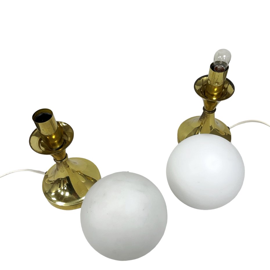 Oryginalna para lamp stołowych wyprodukowana przez AKA Leuchten (Niemcy) w latach 60.–70. XX wieku. Klasyczna, elegancka forma z kulistymi kloszami z mlecznego szkła opalowego oraz masywnymi, stabilnymi podstawami wykonanymi z mosiądzu.