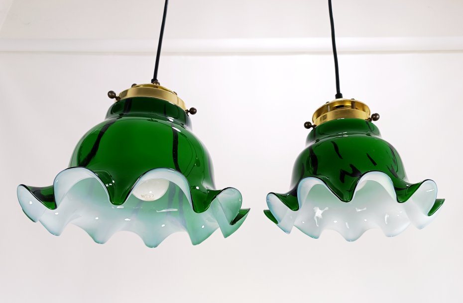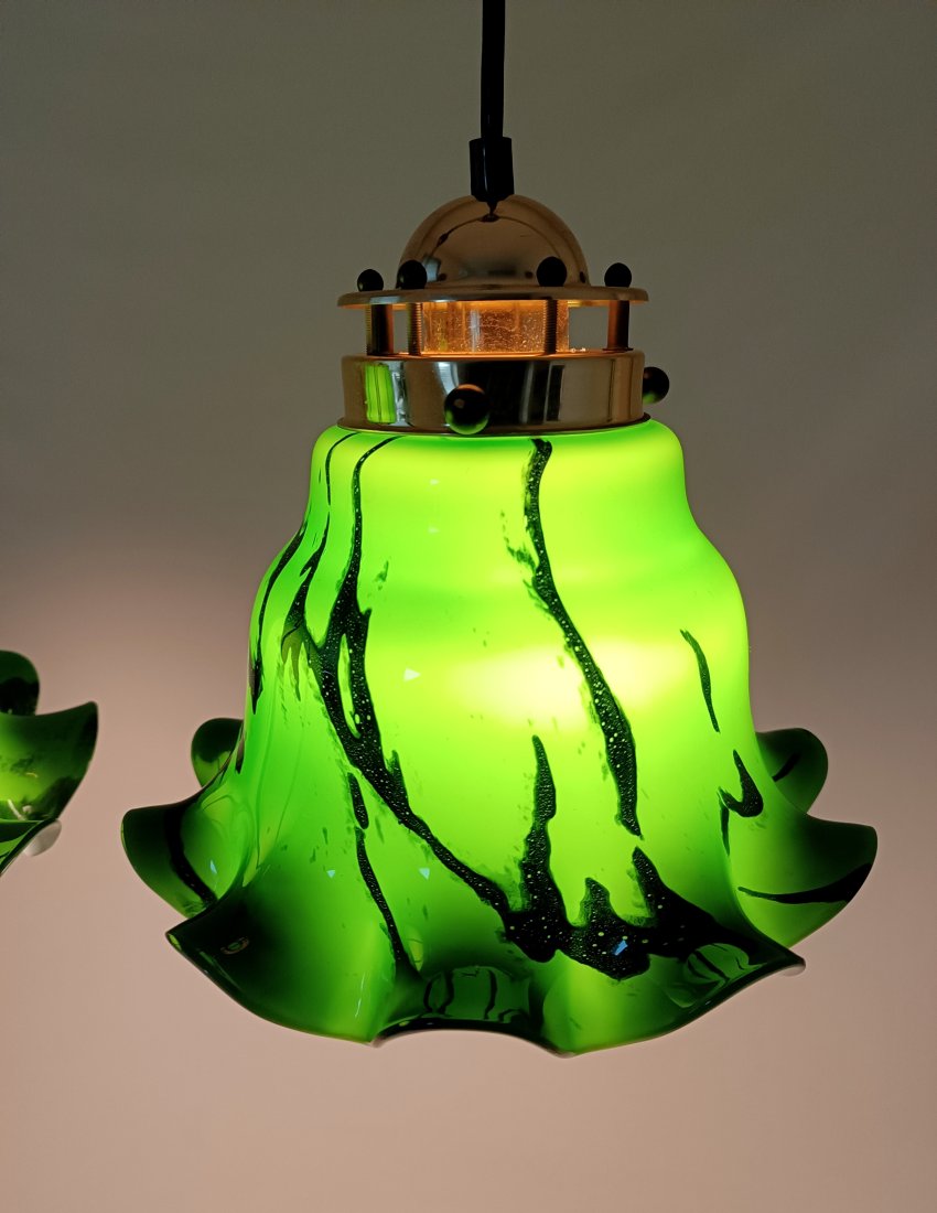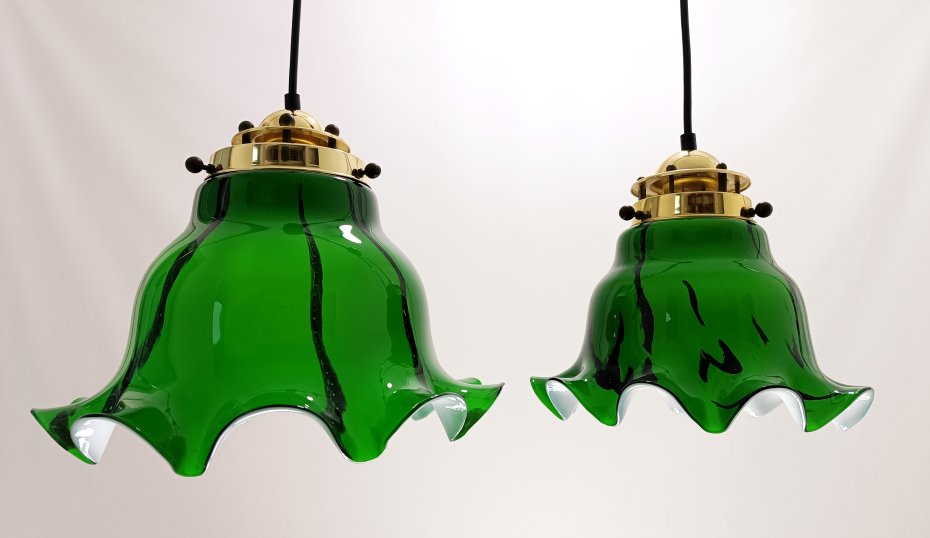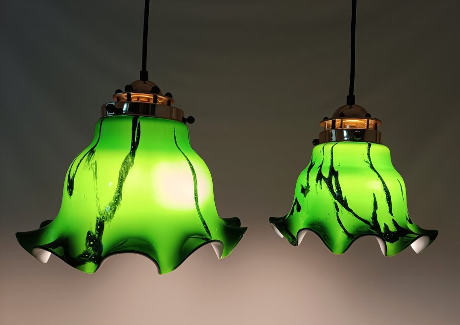 Para szklanych lamp wiszących wykonanych przez niemiecką hutę szkła Peill & Putzler w latach 60. Klosze wykonane są z grubego, ręcznie dmuchanego szkła w odcieniu zieleni. Wewnątrz klosze są białe, dzięki czemu lampy dają naturalne światło. Średnica większej lampy 32 cm. Średnica mniejszej lampy 24 cm. Wysokość około 57 cm. Na metalowych oprawkach występują przetarcia. Poza tym lampy są bardzo dobrym stanie, klosze są bez uszkodzeń.