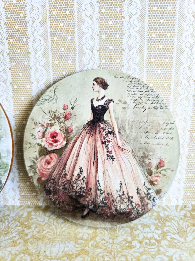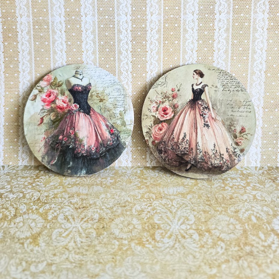 Mają kształt kółek. Z obu stron wzory pięknych dam i sukni