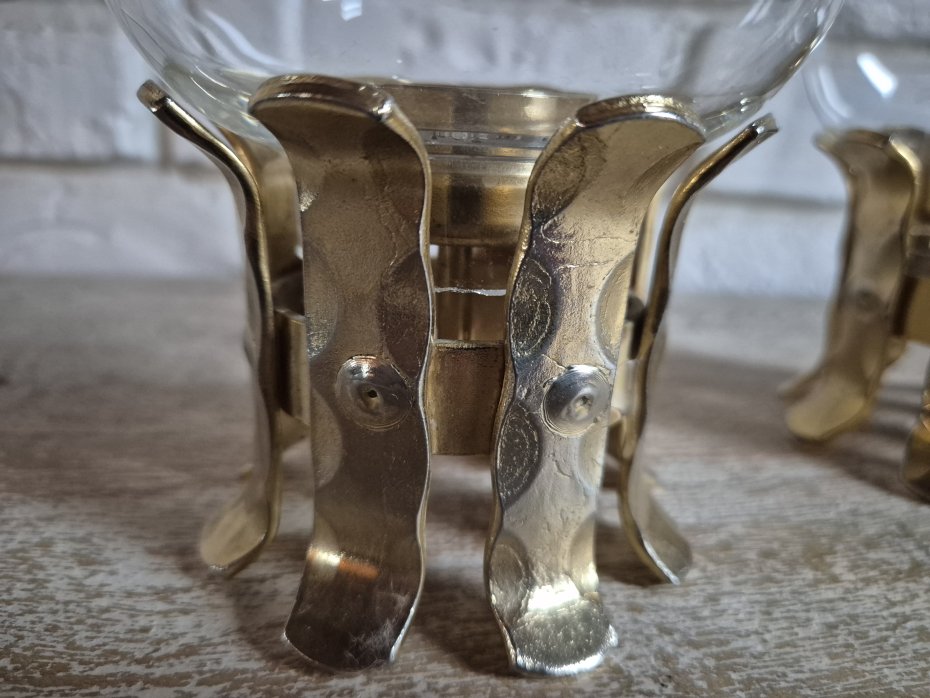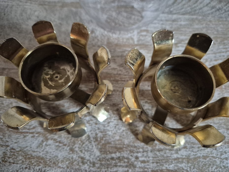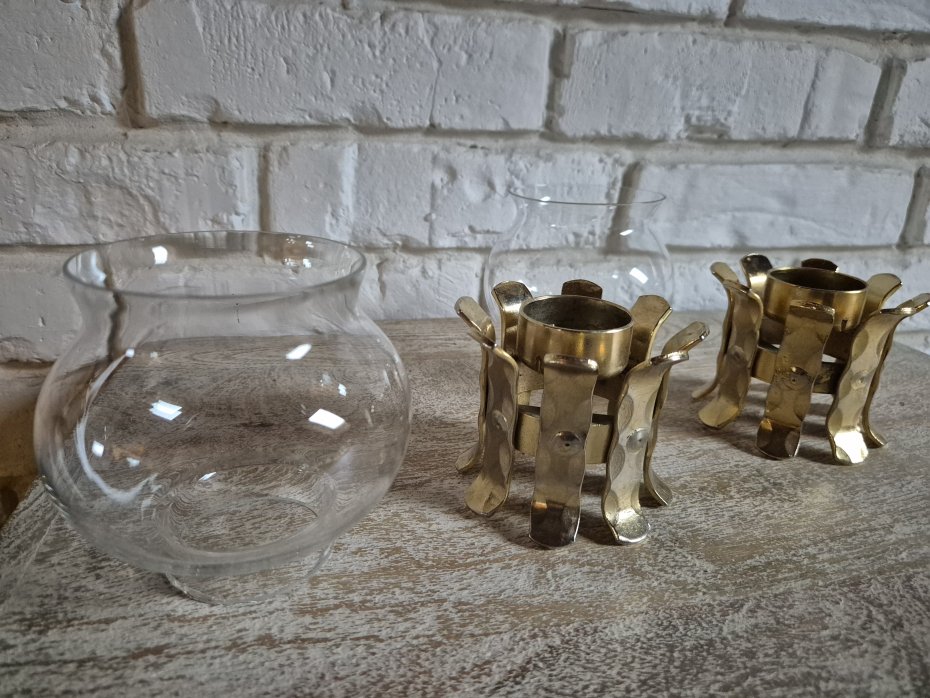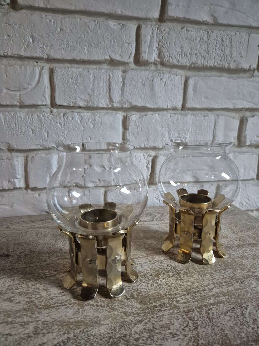 piękne nieduże dwa świeczniki skandynawskie vintage na tealighty, podstawy świeczników w kolorze starego złota, metalowe i dosyć ciężkie, góra to zdejmowane klosze wykonane z cienkiego, lekkiego szkła, brak sygnatur