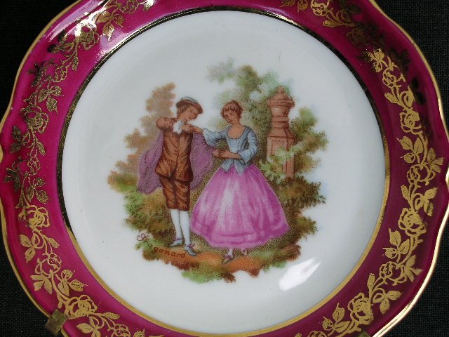 Elegancki i romantyczny talerzyk porcelanowy, sygnowany jakością francuskiej manufaktury Limoges - jako obrazek do powieszenia, lub stojąca dekoracja - z tyłu dwu-funkcyjny sprytny uchwyt druciany. Sygnowany. Złocony. Przyjemna kolorystyka i elegancja stylu. 8,5 x 1,5 cm. Stan zachowania bardzo dobry.