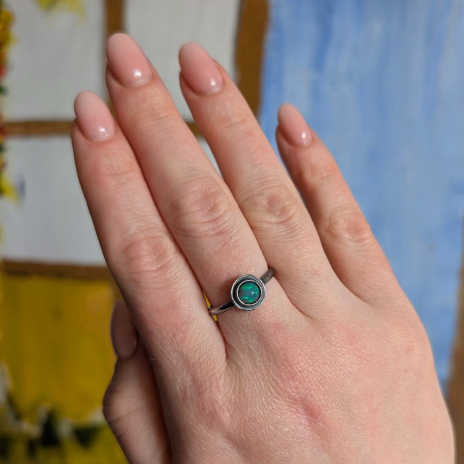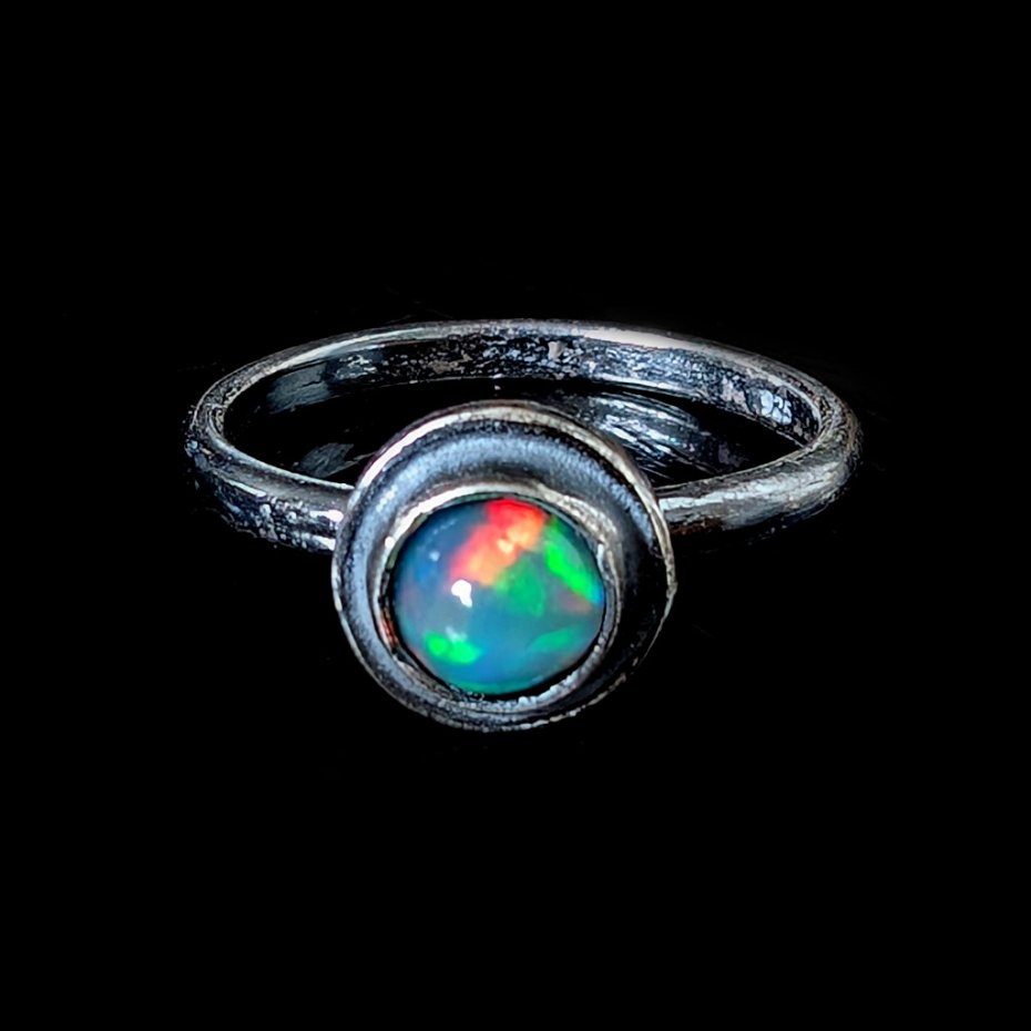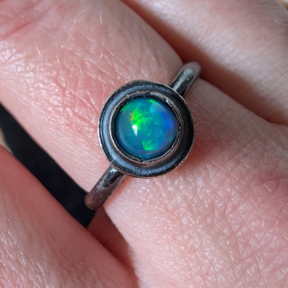Pierścień z oprawionym opalem etiopskim o niebieskiej tafli z zieloną poświatą. Srebro pr.925, oksydowane. Srednica oprawy 9 mm. Waga 2,5 g. Rozmiar jubilerski 18. Obrączka ma 2 mm szerokości. Zapakowany w ozdobne pudełeczko.