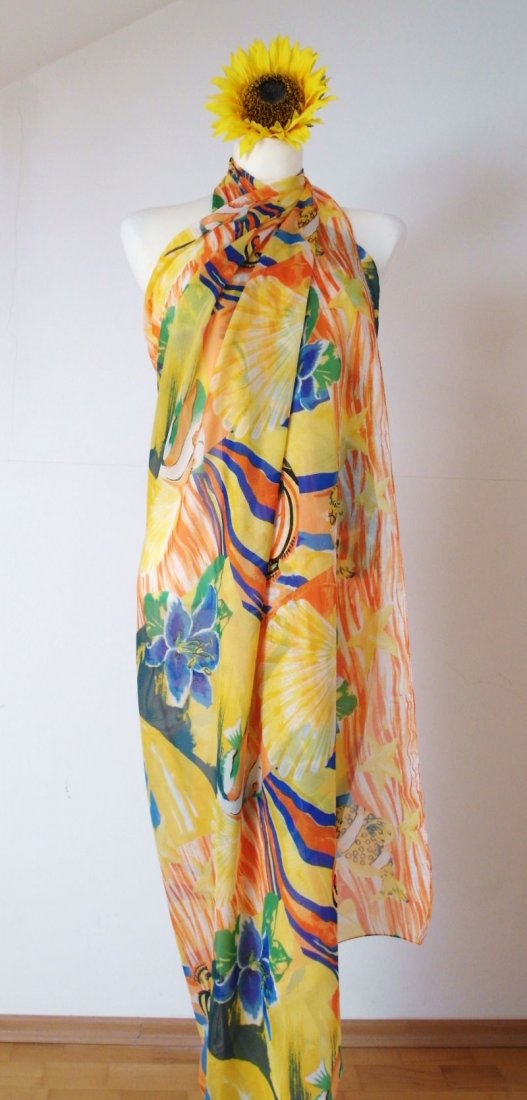 Piękne , zwiewne pareo / chusta w soczystych kolorach z przewagą żółtego.