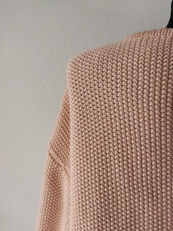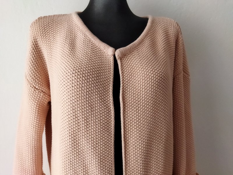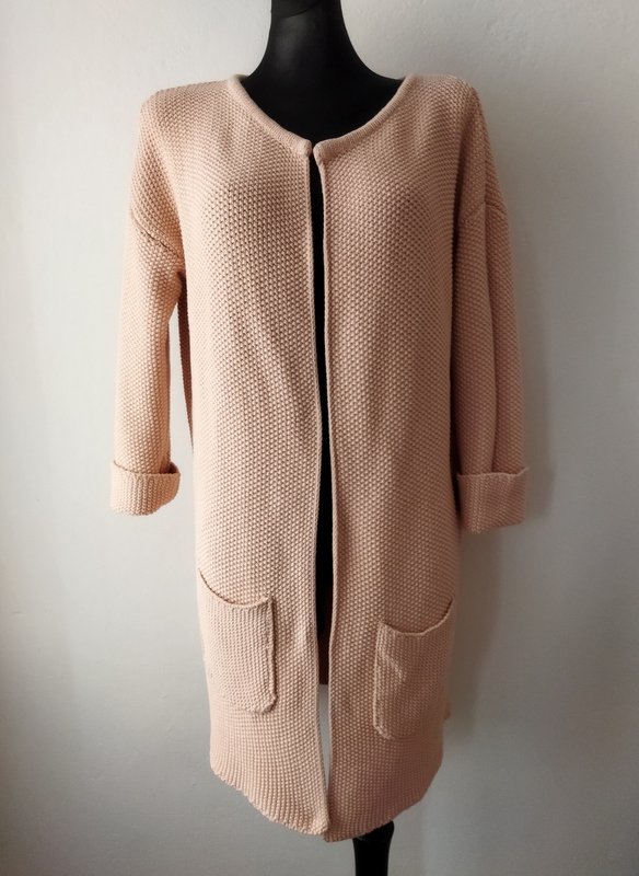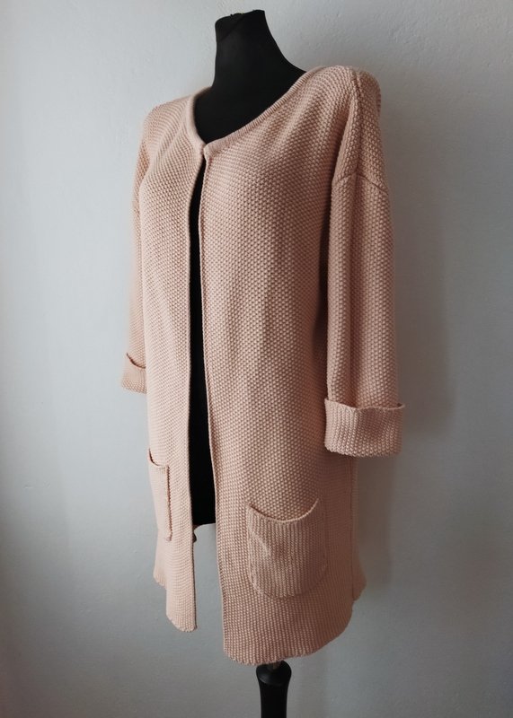 Dłuższy sweter typu kardigan z bawełnianej włóczki w stonowanym bladego różu, wykonany zwartym ryżowym ściegiem. Fason otwarty z dwiema naszywanymi kieszeniami , z rękawami 3/4 z wywijanymi mankietami.