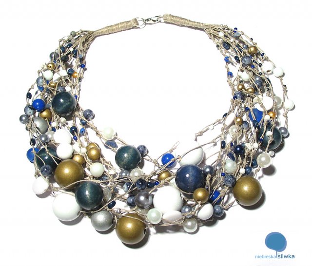 Piękny połyskujący oszronionym srebrem naszyjnik lniany wykonany na naturalnej przędzy z elementów drewnianych (max. średnica 2 cm), szklanych, crackle,, szklanych perełek, sodalitu i howlitu. Długość naszyjnika mierzona wewnątrz po zapięciu ok. 48 cm, zapięcie posrebrzane.