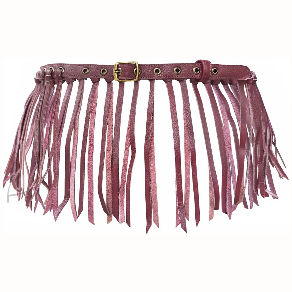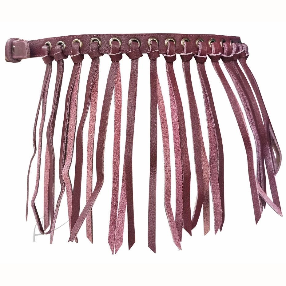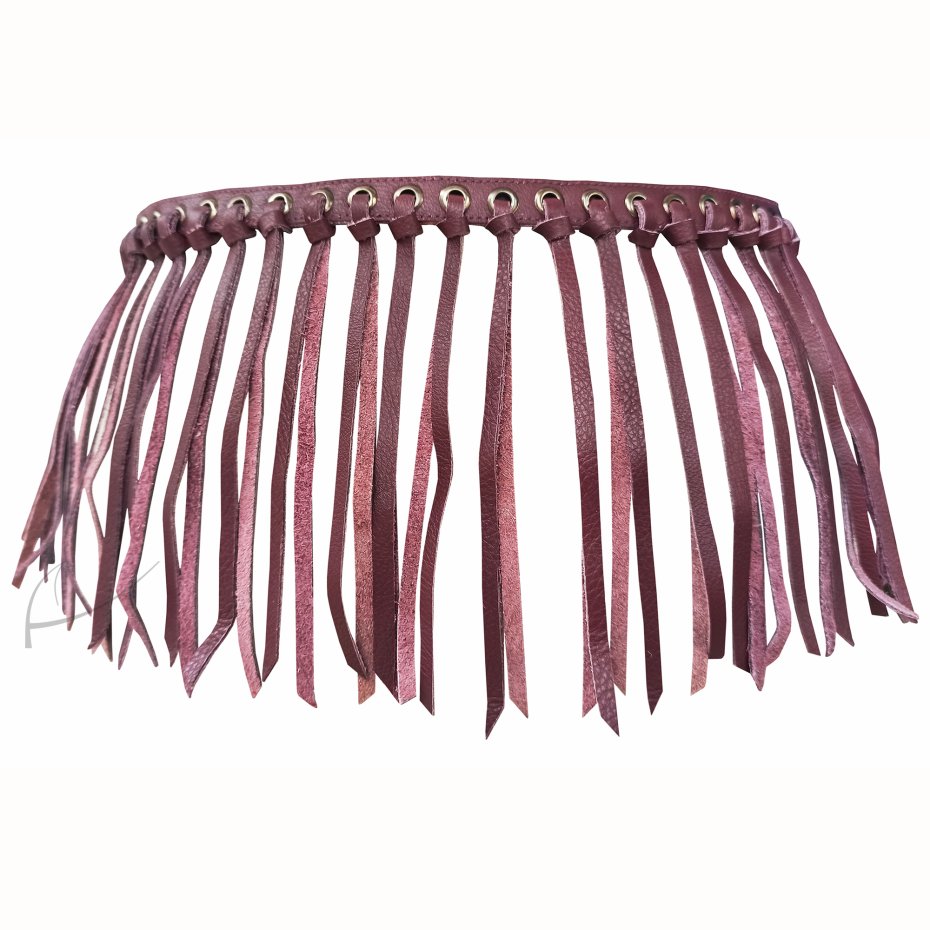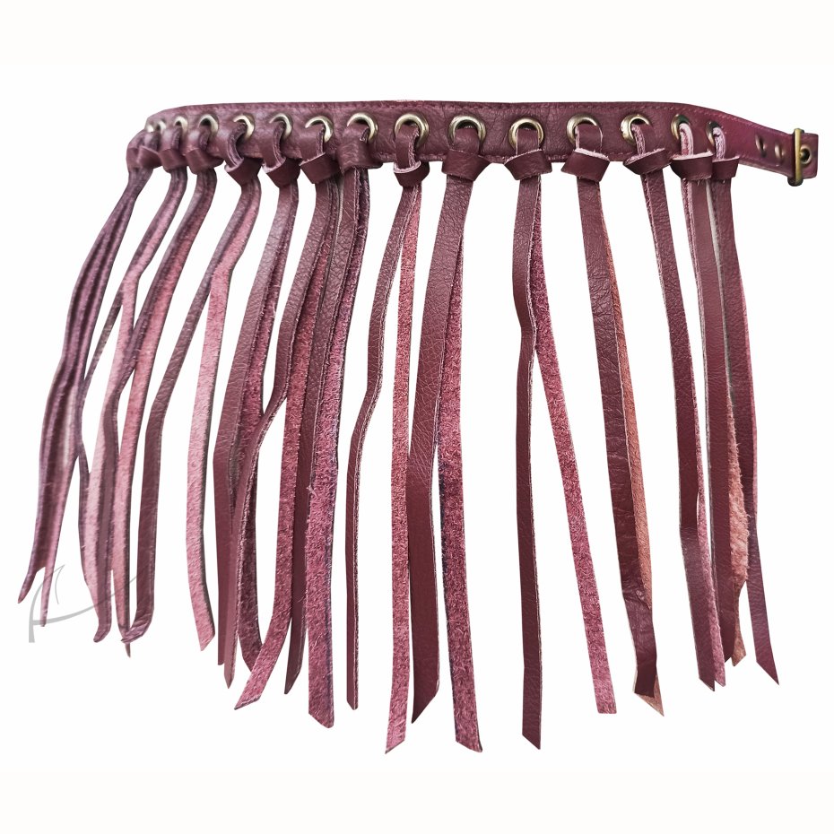 Etniczny pasek skórzany z frędzlami w kolorze burgundowym, zaprojektowany do noszenia na talii lub biodrach. Smukła forma o szerokości 1,5 cm, uzupełniona metalowymi oczkami, przez które przewleczone są skórzane rzemienie, tworzy dynamiczny, graficzny efekt w ruchu. Pasek podkreśla sylwetkę i nadaje stylizacjom wyrazisty, charakterystyczny akcent.