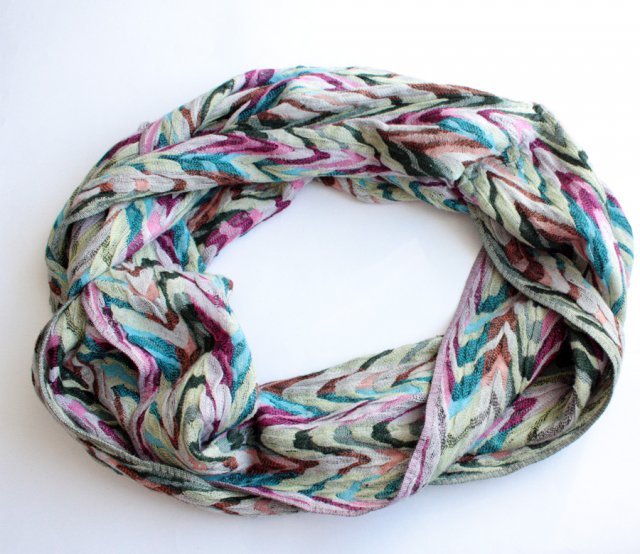 Szal Pashmina wykonany z jedwabiu. Materia jest uciągliwy i plisowany w nieregularne wzory, dzięki czemu tworzą się wypuklości w strukturze tkaniny.