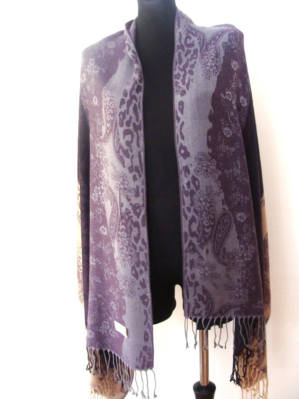 Wzorzysty, dobrej jakości szal z jedwabiem w pięknej stonowanej kolorystyce odcieni fioletu, szarości z kropla fioletu , beżu, brunatnego brązu i czerni. Można nosić na obydwie strony. Wykończony frędzelkami.