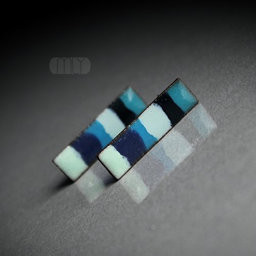 Ceramiczne podłużne kolczyki, ręcznie wykonane z delikatnej gliny kamionkowej, jednostronnie szkliwione mieszanką błękitnych szkliw z efektem plamek, tył matowy czekoladowobrązowy na antyalergicznych sztyftach.długość ok 2,5cm. Polecam