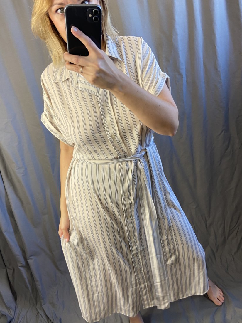 Pasiasta sukienka z przemiłego w dotyku poliestru. Zapinana na guziczki, wiązana w pasie.