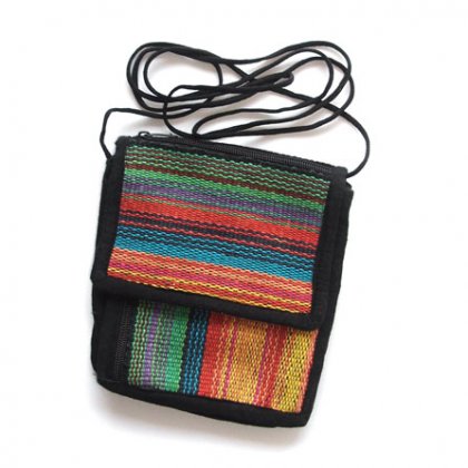 Mała torebka na drobiazgi. Można ją nosic na krzyż ze względu na długi sznurek lub mocując przy pasku, ponieważ posiada z tyłu szeroką szlufkę. Zapinana na długi rzep pod klapką. W środku czarna podszewka oraz kieszonka. Torebka ma równiez dwie kieszonki na suwak (jedna w klapce, druga z przodu. Szer. 15 cm, wys. 18 cm; bok,dno 5 cm. Stan bradzo dobry. Wyprodukowana w Nepalu.
