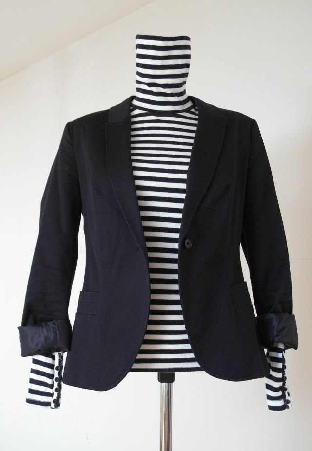 Paski biało granatowe, dosyć elastyczny, przy mankietach rząd guziczków.