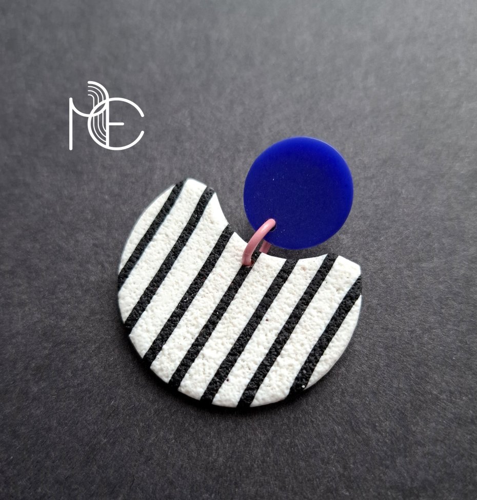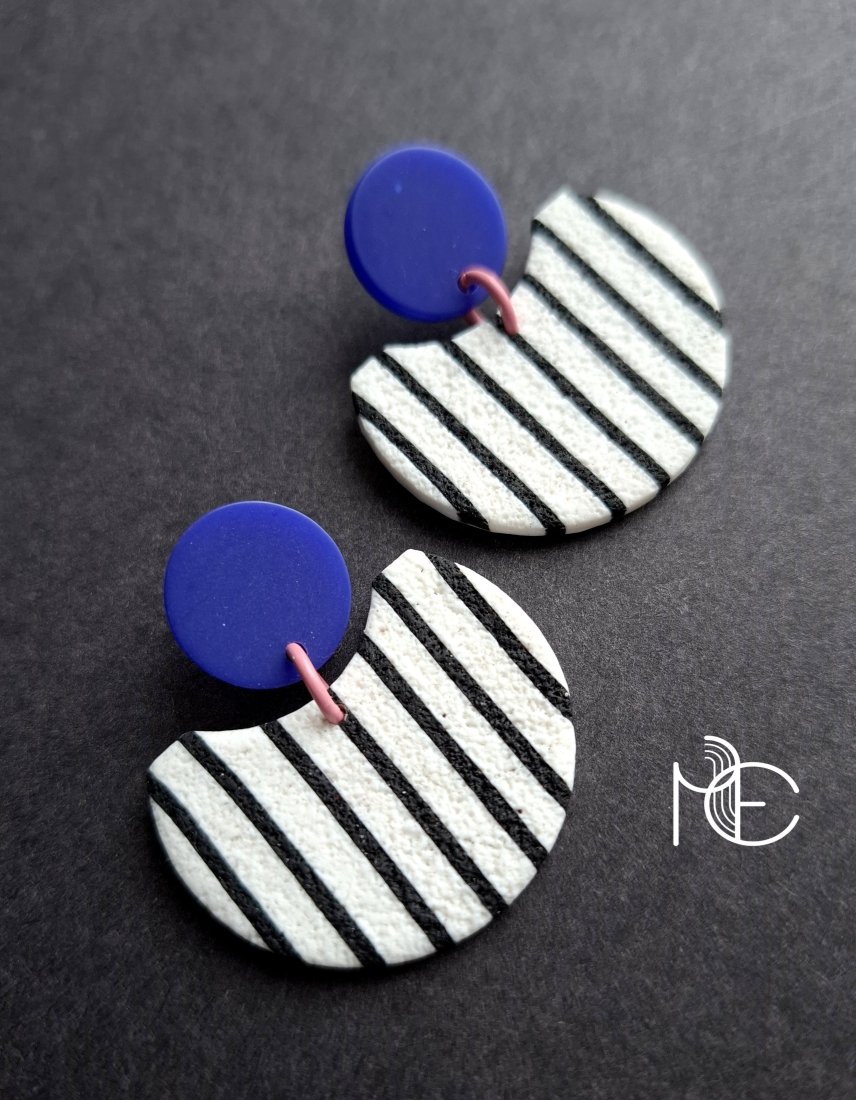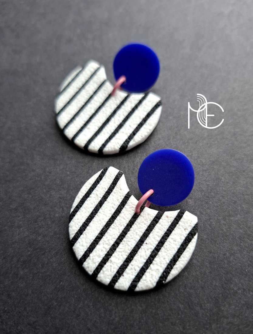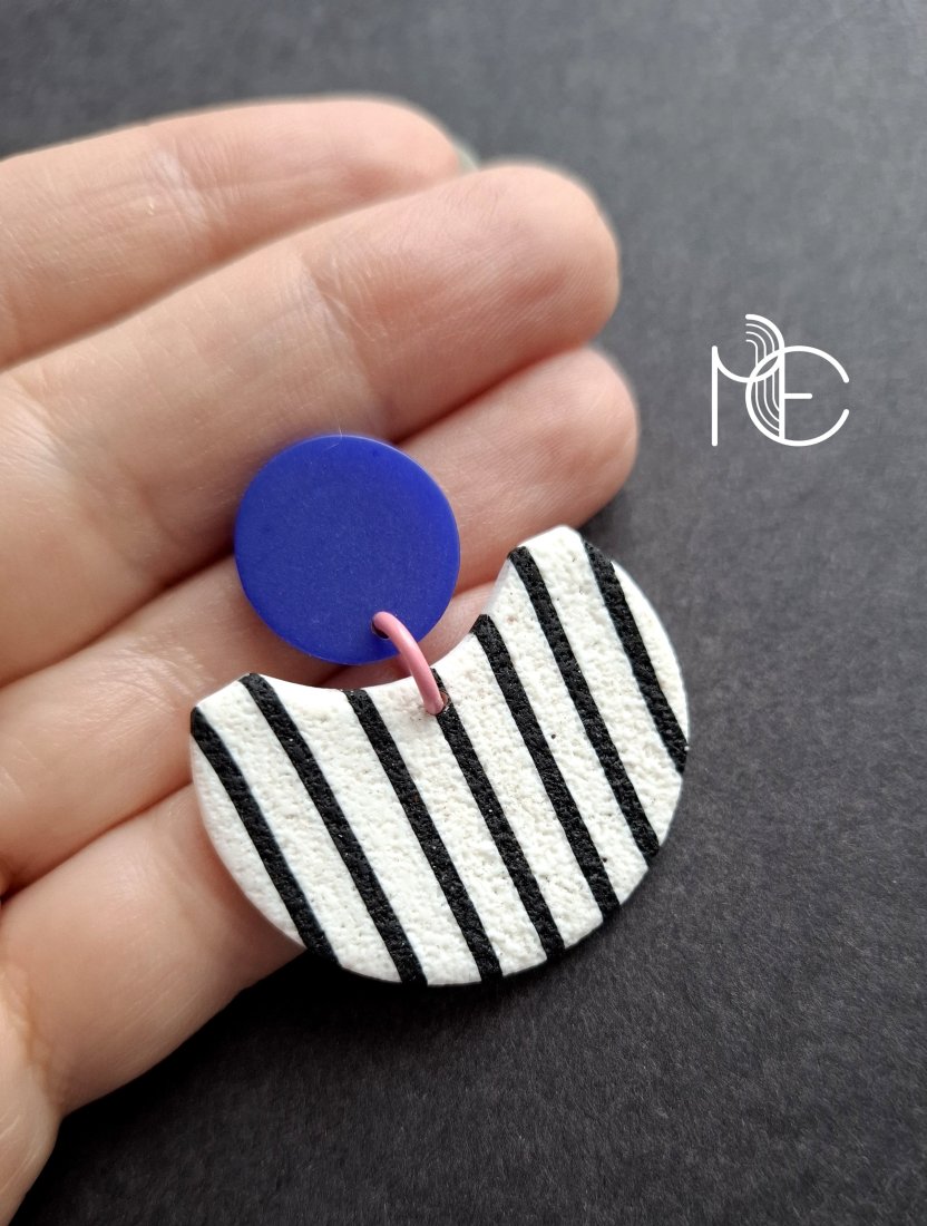 Lekkie, minimalistyczne sztyfty wykonane z wysokiej jakości glinki polimerowej z dodatkiem ozdobnych elementów akrylowych. Sztyfty posrebrzane i nieuczulające. Wymiary kolczyków: długość całkowita: 4,1 cm, szerokość max. 3,5 cm.