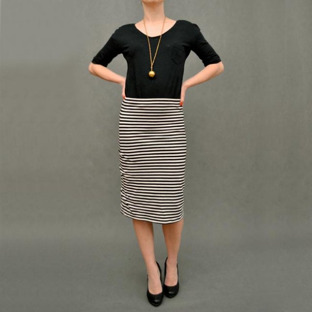 Dopasowana spódniczka w biało czarne paski. Elastyczna, grubsza dzianina. Polecam.