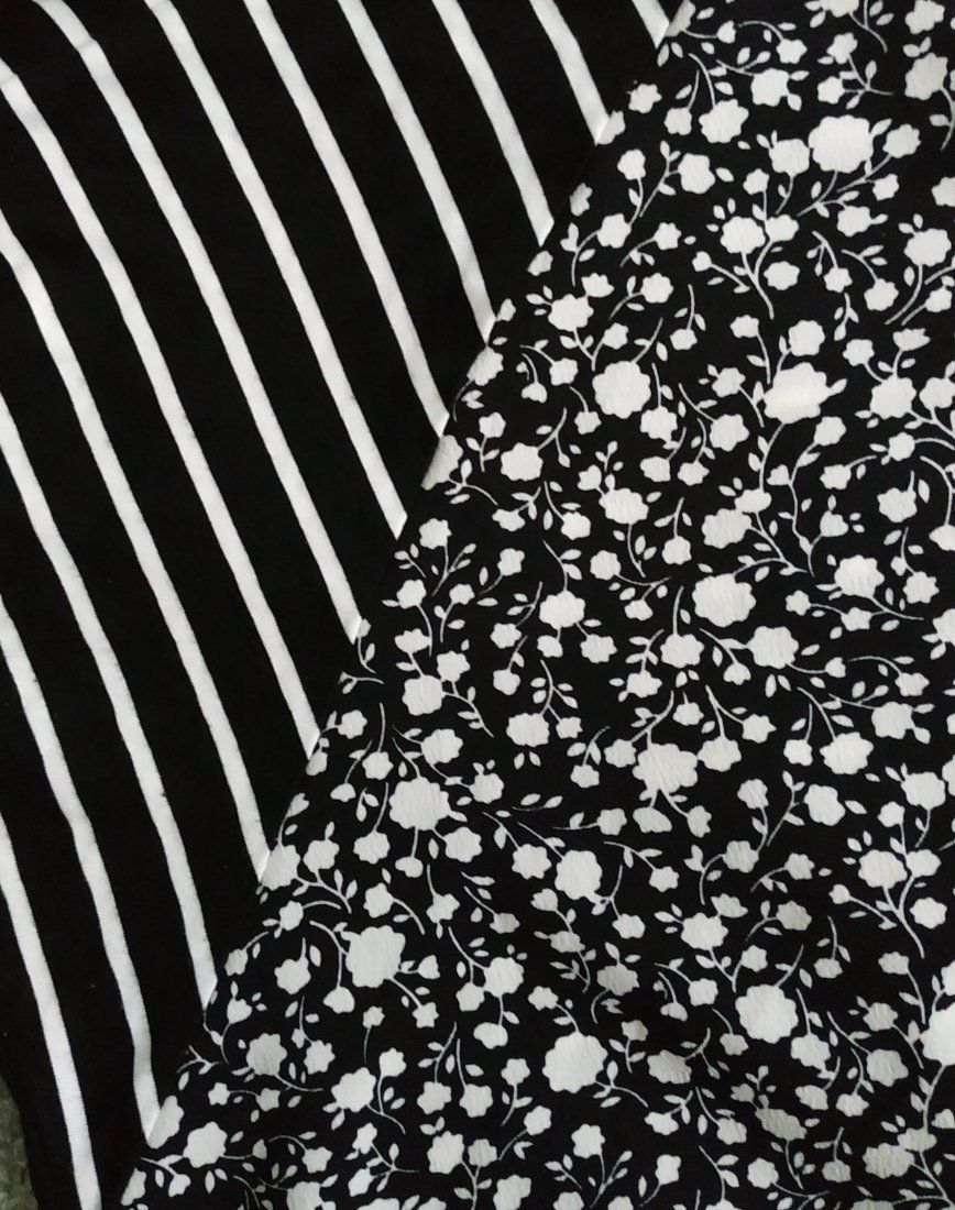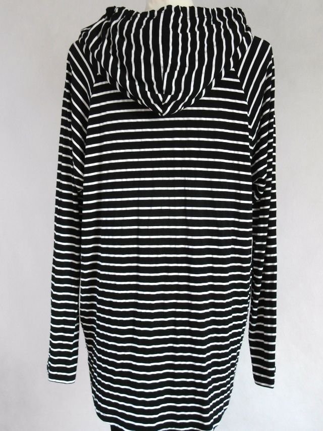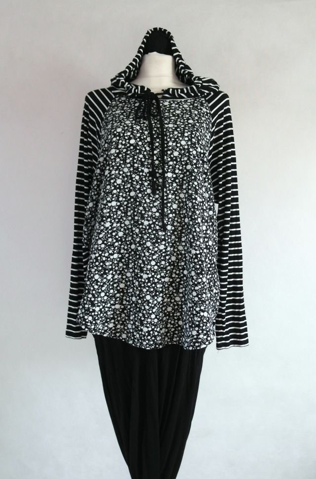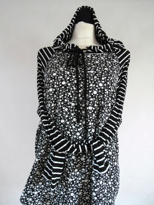 Przód w drobne kwiatki. tył,rękawy oraz kaptur w czarno białe paski.Luźny fason, boki troszkę krótsze. nie jest gruba, więc fajnie pasuje do cienkich kolorowych golfów.