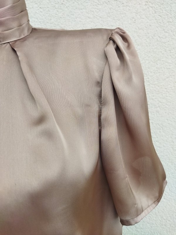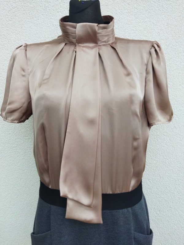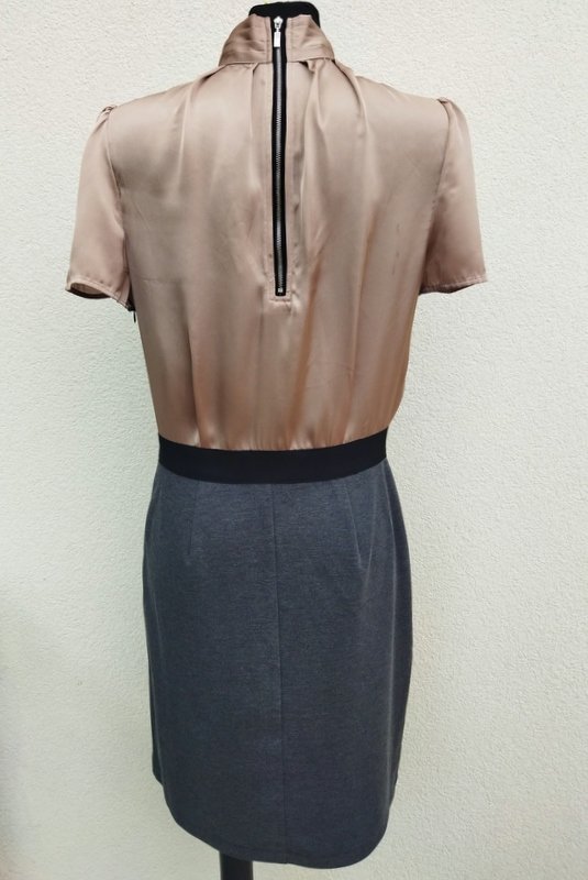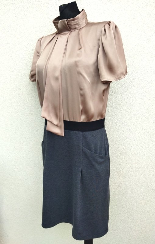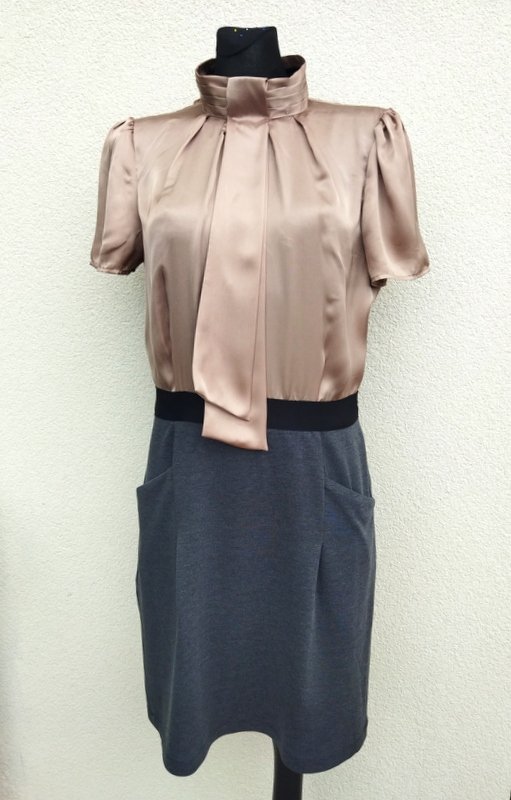 Sukienka z łączonych tkanin: góra z poliestrowej tkaniny z satynowym połyskiem w beżowym kolorze, dół z dzianinowej tkaniny w szarym kolorze. Odcinana w pasie z wszytym paskiem z czarnej taśmy rypsowej, góra z zakładkami z kołnierzem stójką z poziomymi zakładkami i wiązaniem na kokardy, dół ołówkowy z dwiema wpuszczanymi kieszeniami . zapinana z tyłu na zamek drugi i drugi z boku.