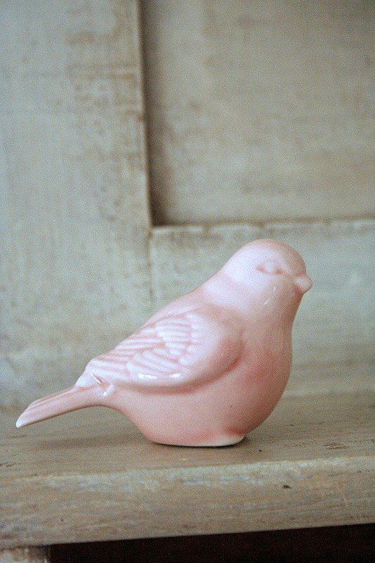 Ciekawy ceramiczny ptaszek w kolorze pastelowego różu. W pozycji siedzącej:)