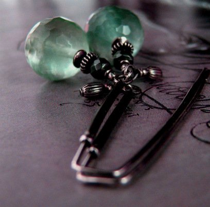 Długie, misternie plecione kolczyki na bazie oksydowanego/polerowanego srebra prób 925, 930 oraz 14mm fasetowanych kul błękitno-zielonego fluorytu (wraz ze srebrem tworzą wyrazistą, "mroczną" całość), maleńkich fasetowanych oponek hematytu. Długość całkowita: 60mm, długość części mobilnej blisko 30mm. Biżuterię wysyłam ozdobnie zapakowaną, listem ubezpieczonym.
