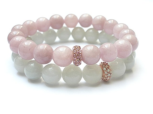 Komplet dwóch bransoletek wykonanych z naturalnych minerałów: jadeity [10mm] oraz ekskluzywnych przekładek wysadzanych cyrkoniami. Bransoletki na gumce silikonowej. Bransoletki będą pasowały na nadgarstek 15,5-16,5cm.