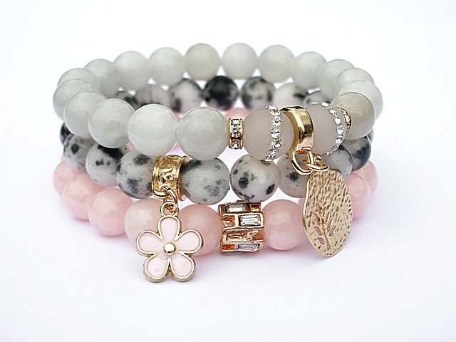 PROJEKT AUTORSKI. WSZELKIE INNE PODOBNE MODELE TO KOPIE NARUSZAJĄCE PRAWA AUTORSKIE. Komplet trzech bransoletek wykonanych z naturalnych kamieni: jadeity [10mm], marmur [10mm], agaty wysadzane cyrkoniami [10mm], przekładek wysadzanych kryształkami, ekskluzywnej przekładki z miedzi wysadzanej cyrkoniami oraz elementów metalowych w kolorze tzw. różowego złota. Bransoletki pasują na nadgarstek 15,5 - 16,5cm. Biżuteria ozdobnie zapakowana