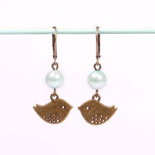 Kolczyki wiszące, na angielskich biglach w kolorze starego złota. Perełka szklana w odcieniu pastelowo turkusowym. Można też zamówić te kolczyki z perełką różową, taką jak w bransolecie Do kompletu można nabyć bransoletę i naszyjnik. :) . Można zamienić lewy z prawym i wtedy ptaszki będą lecieć na zewnątrz.