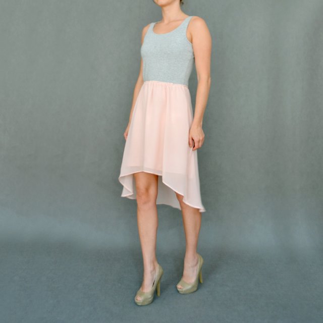 Piękna pastelowa sukienka w połączeniu pudrowego różu i szarości. Dół asymetryczny, zwiewny, na podszewce. Góra elastyczna, z zamkiem z tyłu. W talii gumka. Polecam.