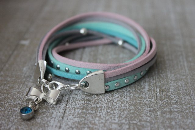 Pastelowa bransoletka, wykonana z ekozamszu oraz metalowych elementów w kolorze srebrnym. Bransoleta z kokardką i turkusowym oczkiem do dwukrotnego zawinięcia wokół nadgarstka. Długość bransolety minimalnie regulowana 40 - 41cm. Kolory rzemieni: pastelowy różowy, pastelowy miętowy, pastelowy turkusowy, popielaty.