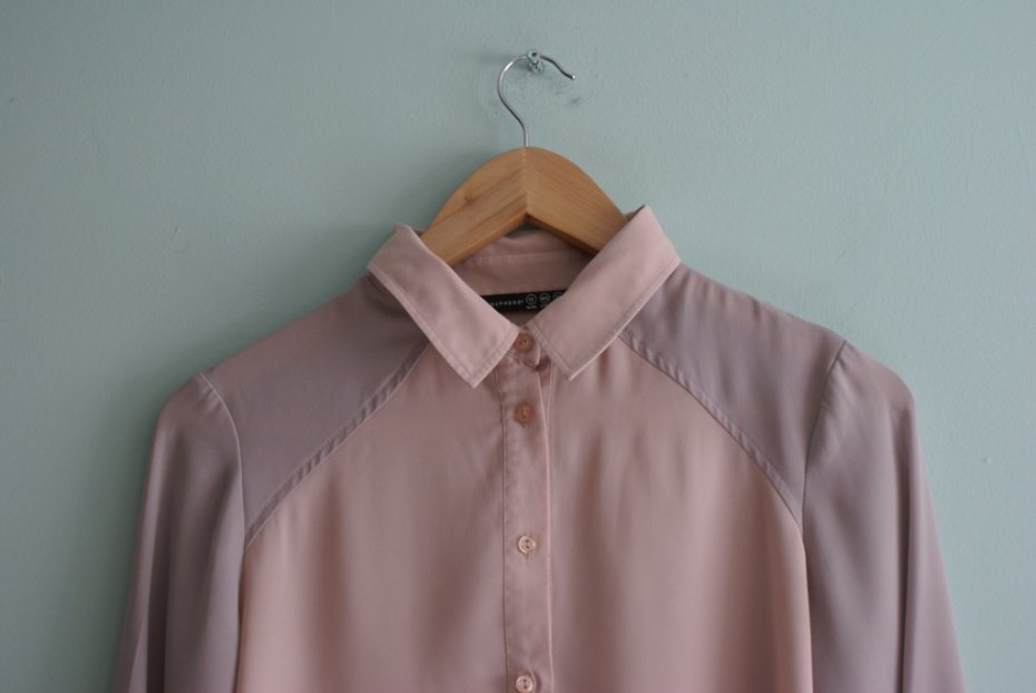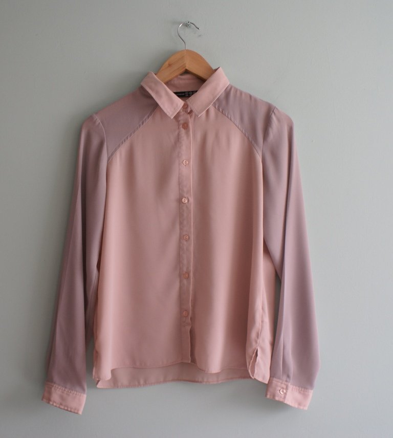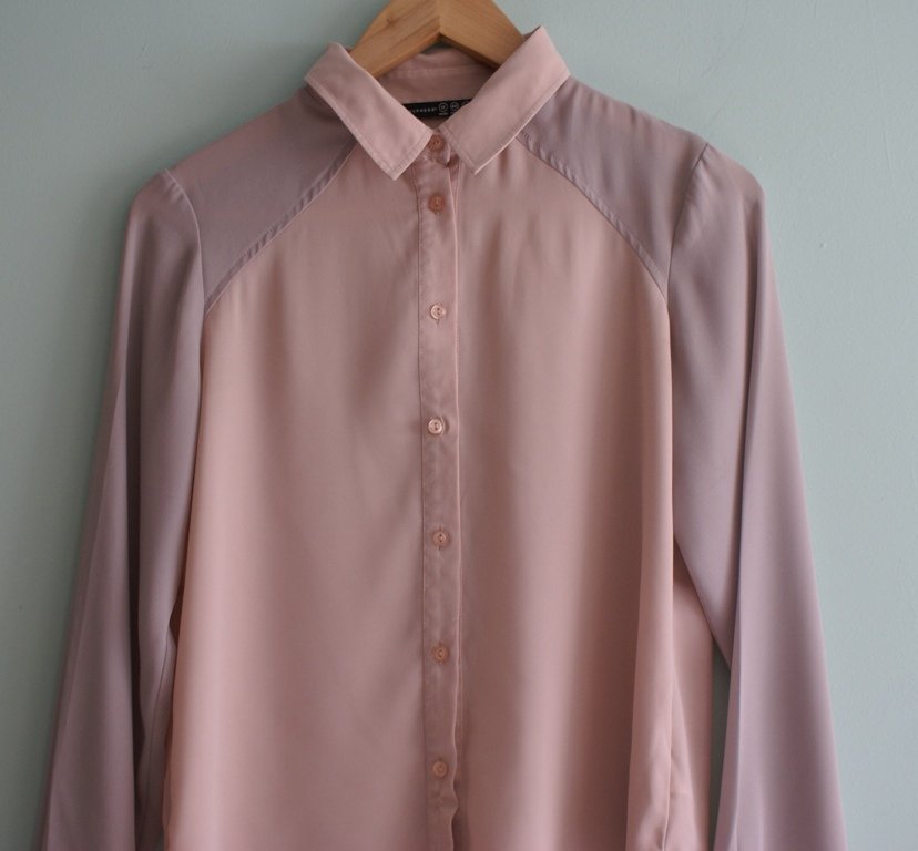 Urocza pastelowa koszula marki Atmosphere. W kolorze pudrowego różu z szarymi rękawami.