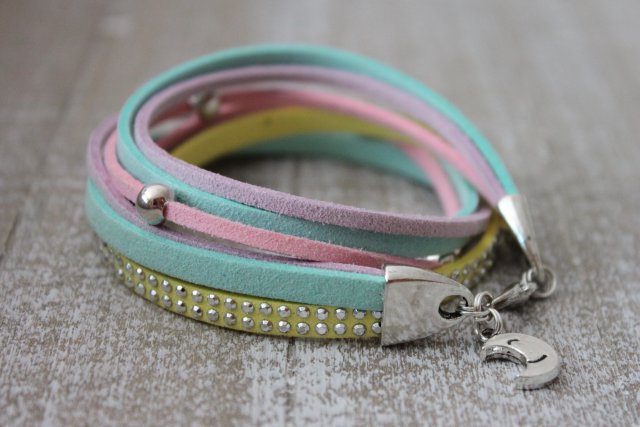 Pastelowa bransoletka, wykonana z ekozamszu oraz metalowych elementów w kolorze srebrnym. Bransoleta do dwukrotnego zawinięcia wokół nadgarstka. Długość bransolety minimalnie regulowana 37,5 - 38,5cm. Kolory: pastelowy żółty, różowy, miętowy i liliowy.