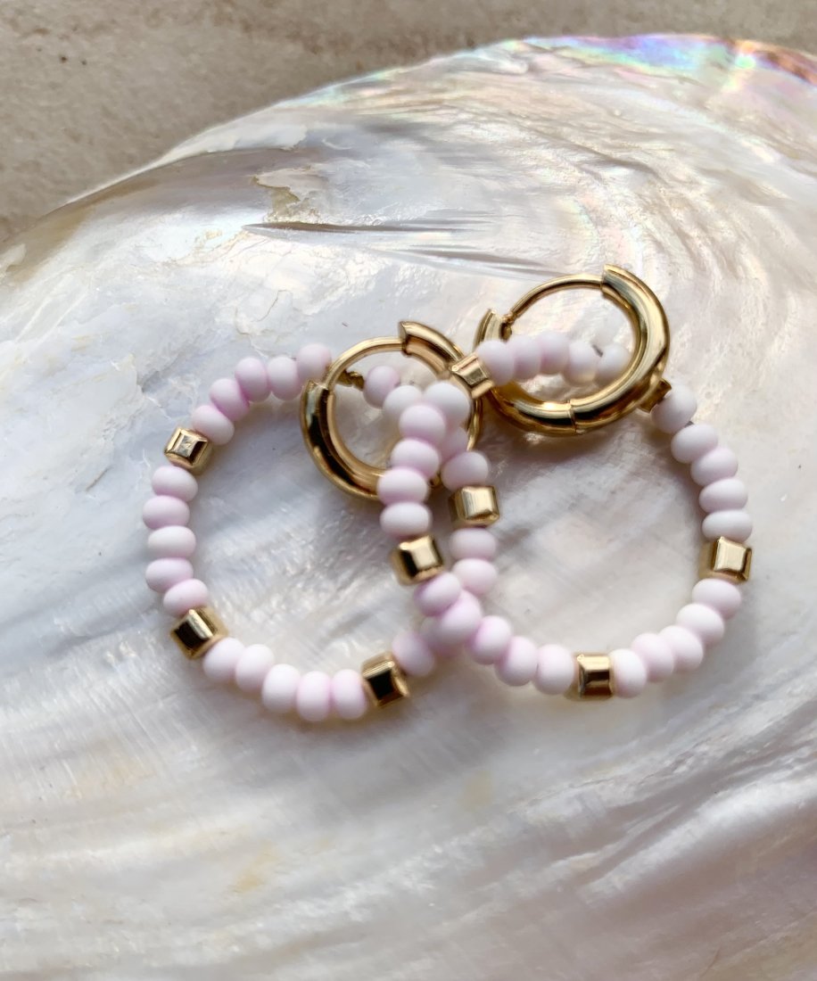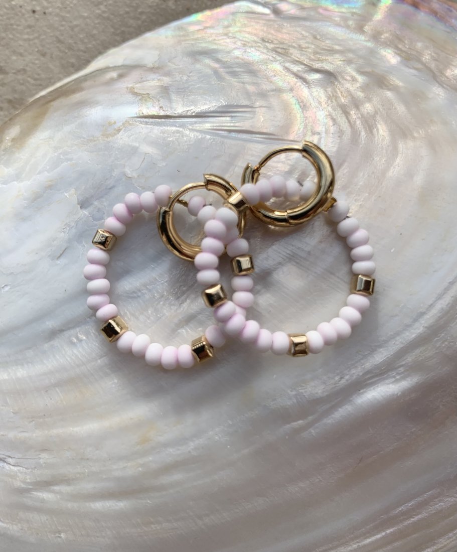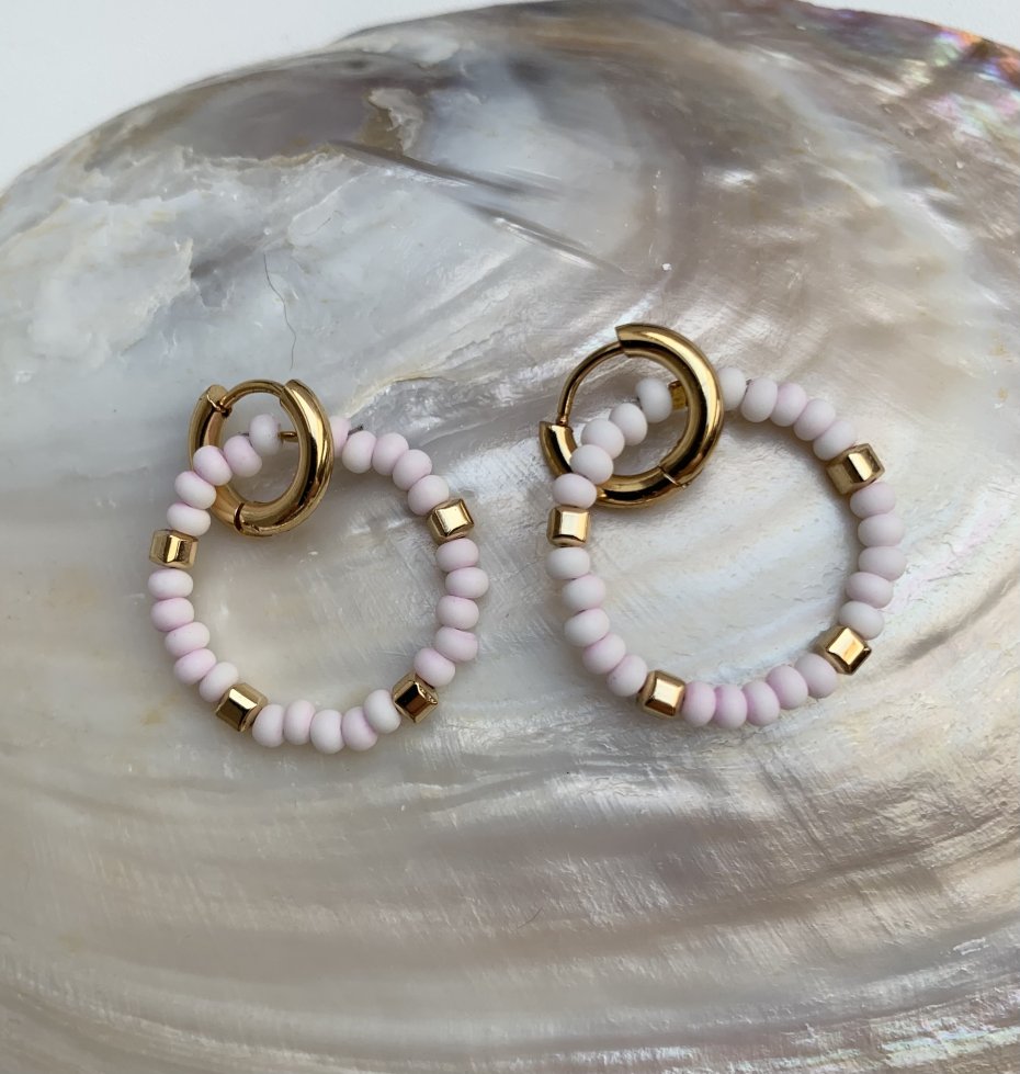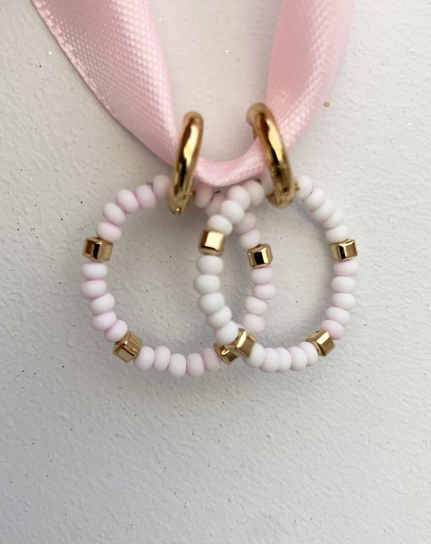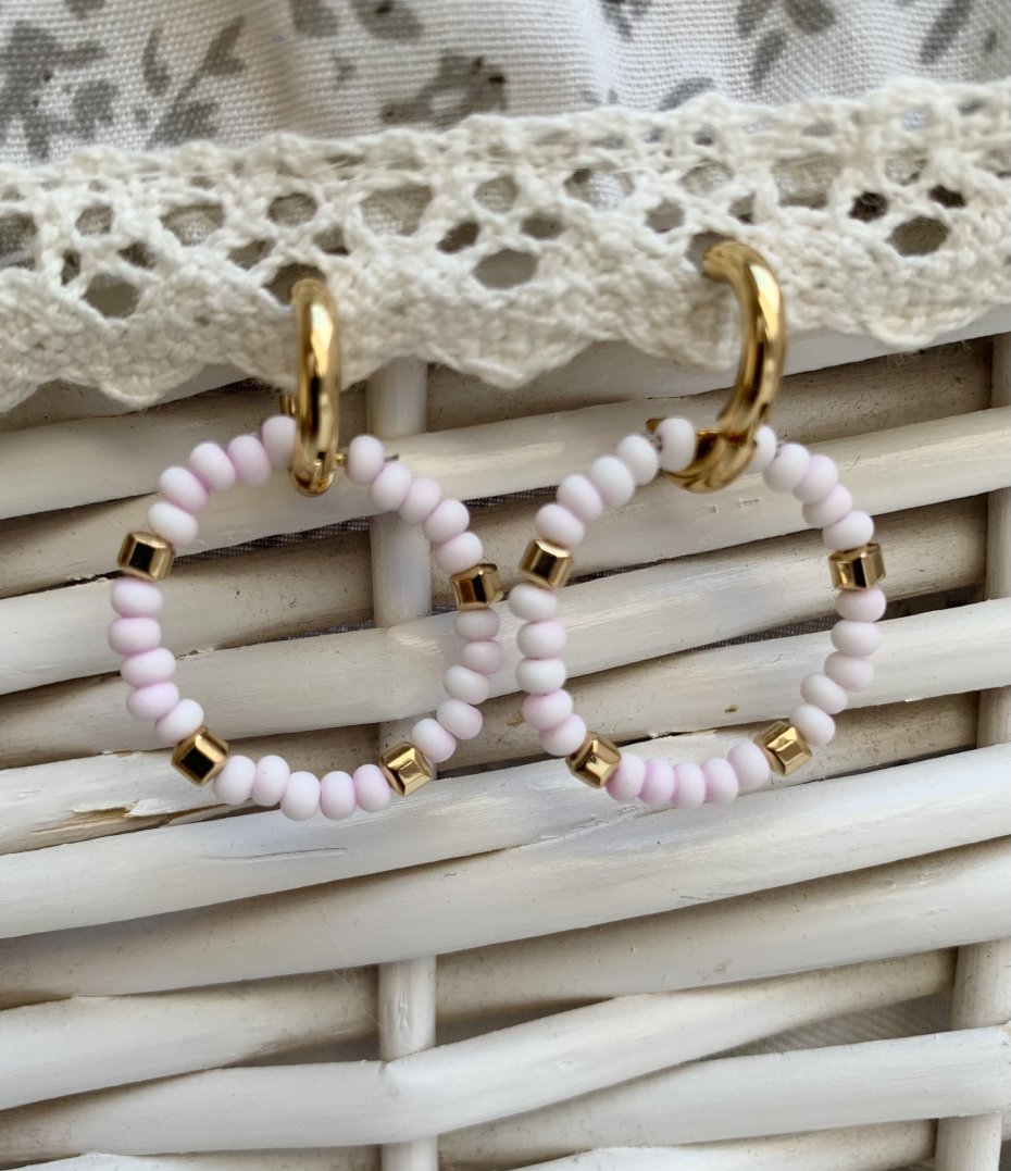 Urocze kolczyki kółeczka w kolorach bardzo delikatnego różu i bieli z pozłacanymi hematytami.