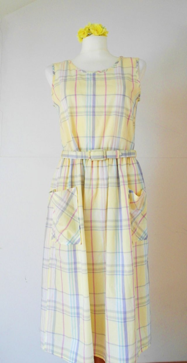 Prosty krój, duże kieszenie zewnętrzne, pasek - bardzo subtelna i kobieca. Śliczna w kolorze - pastelowy cytrynowy w kratkę z jasnym różem i fioletem.