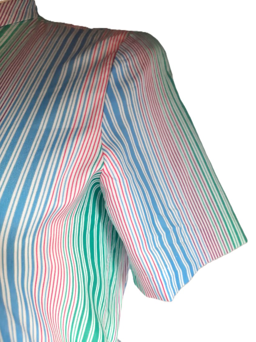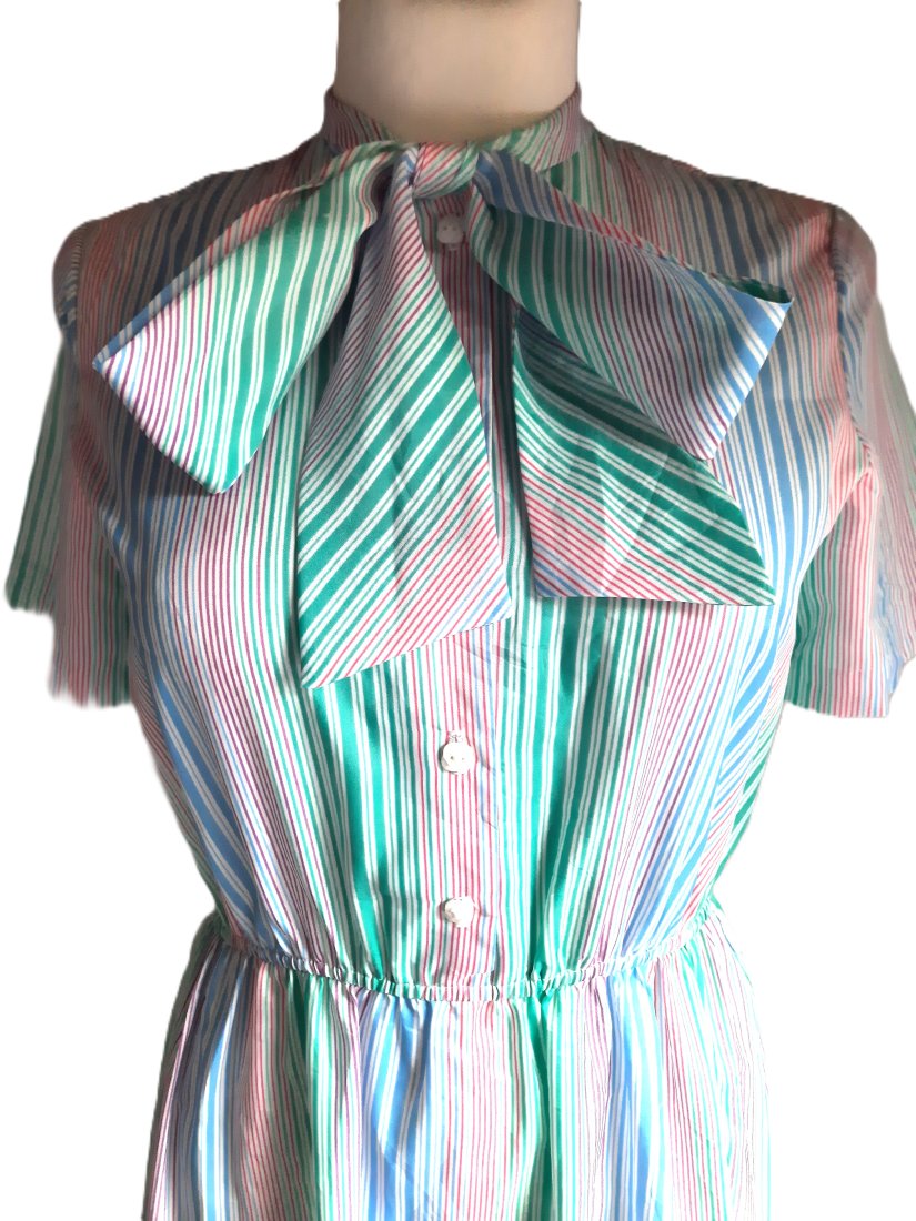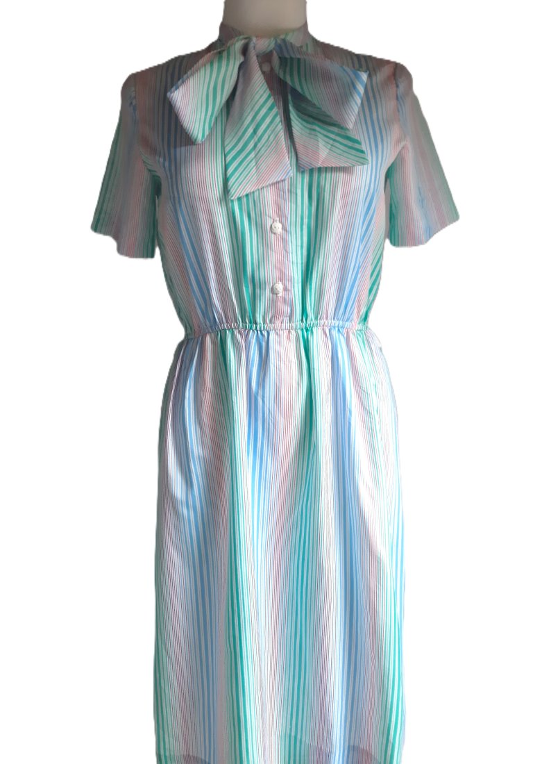 urocza letnia cienka sukienka vintage według mnie z lat 70-tych, w drobne pionowe pastelowe kolorowe paski, pod szyją wiązana, krótki rękawek, zapinana z przodu do połowy na guziki, w pasie gumka, długość za kolano, bez podszewki, posiada szlufki w pasie (paska brak), brak metki ze składem materiału, materiał cienki, śliski w dotyku