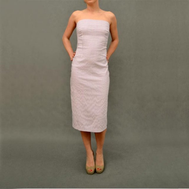 Sukienka w stylu PIN UP od GINY TRICOT. W pastelowo fioletową i białą krateczkę. Długość midi. Cała dopasowana. Materiał lekko się naciąga.