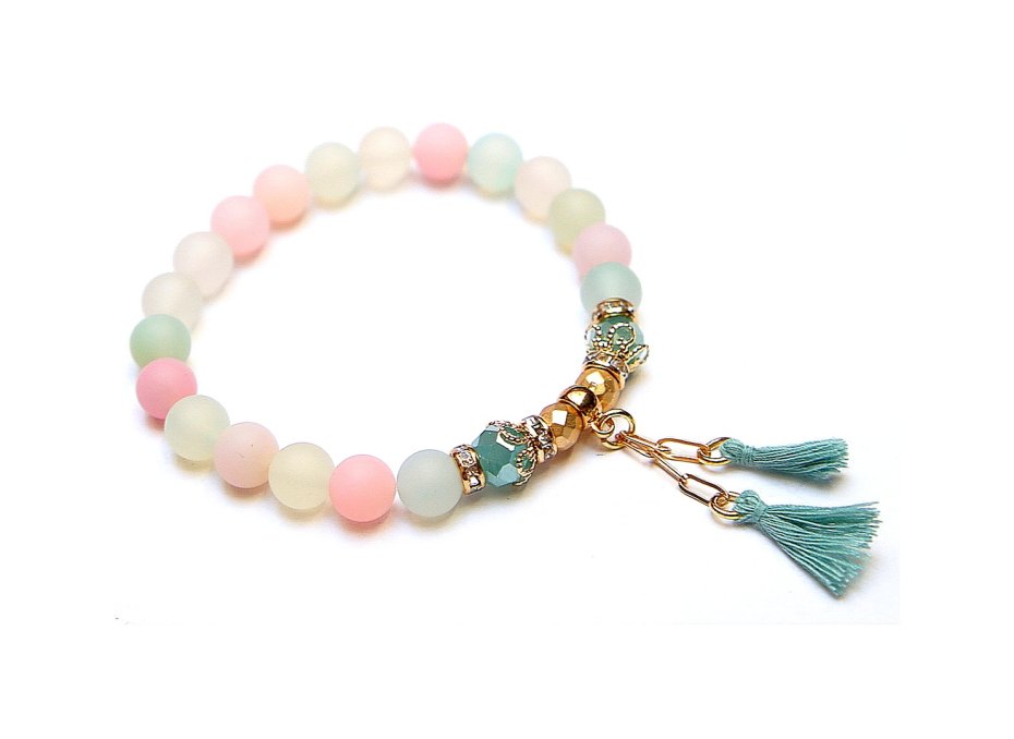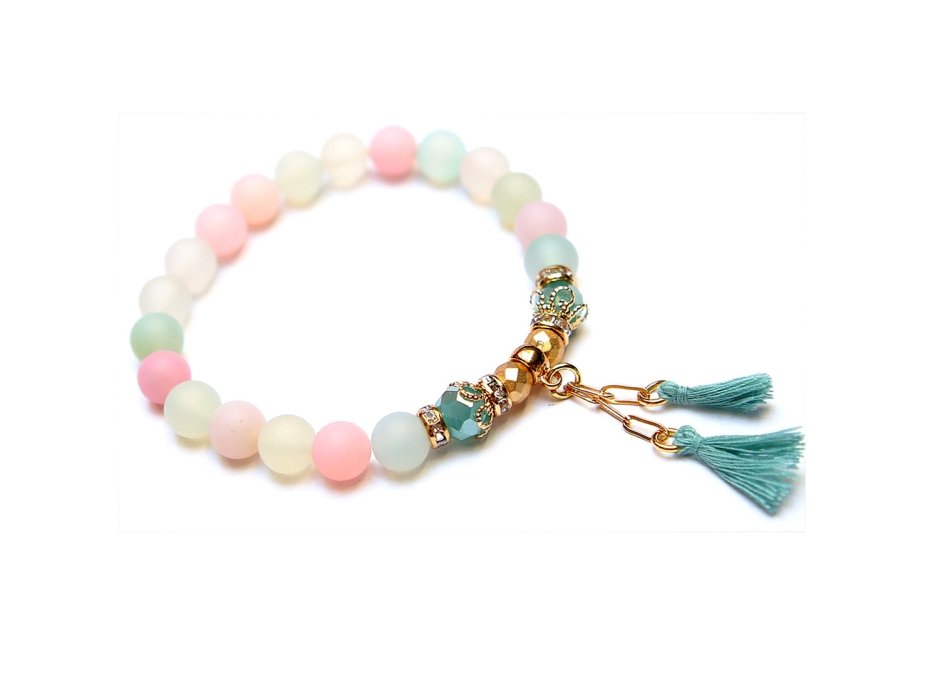 Bransoletka wykonana z naturalnych minerałów - agaty matowe [8mm], kryształki fasetowane [8mm], hematyt fasetowany, platerowany [6mm], chwostów oraz elementów metalowych w kolorze złotym. Bransoletka na gumce silikonowej. Pasuje na nadgarstek 16-17cm. Biżuteria ozdobnie zapakowana.