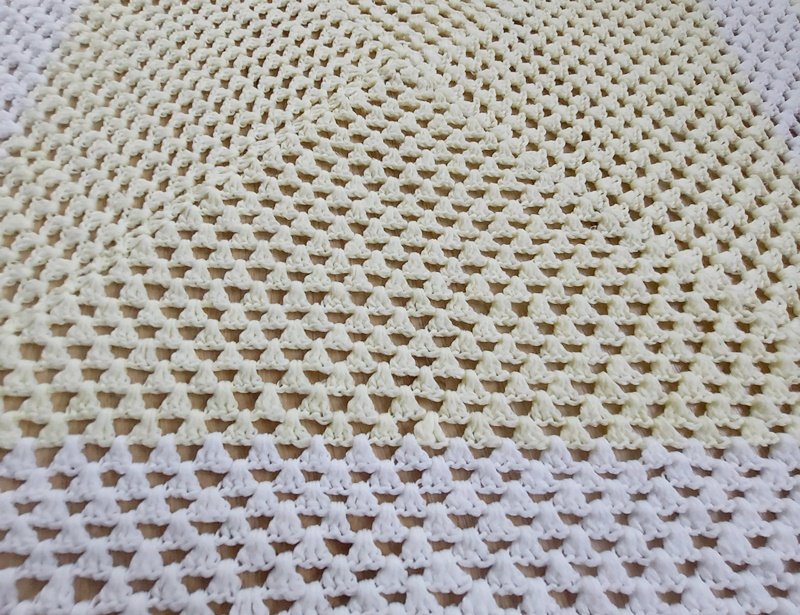 Ten ręcznie wykonany, dziergany koc wniesie do pomieszczenia ciepło i przytulną atmosferę – może zdobić fotel jako narzuta albo posłużyć jako obrus. To vintage’owy egzemplarz stworzony z dużą dawką koloru i fantazji.