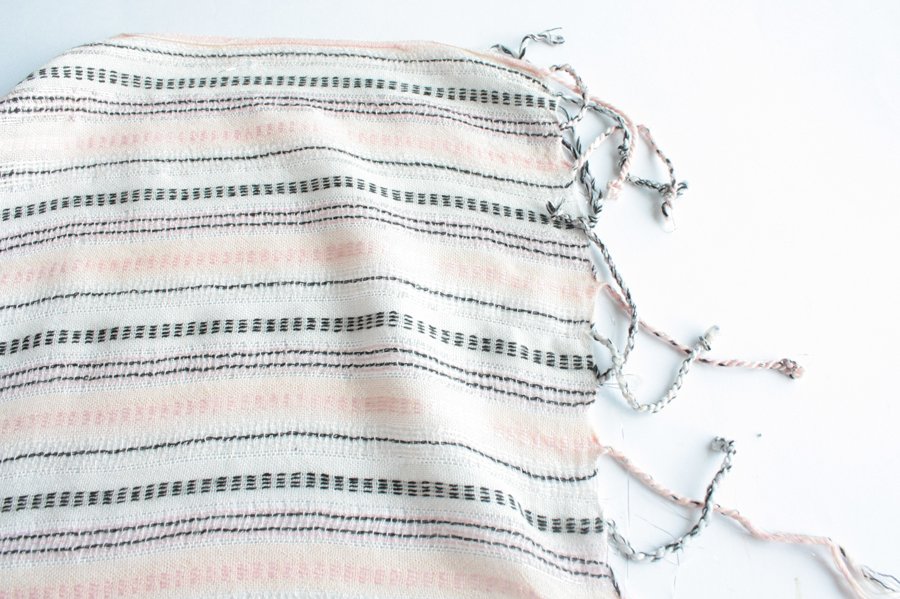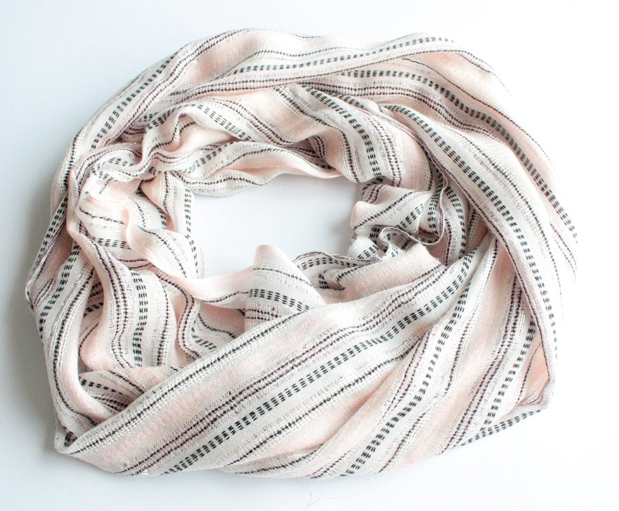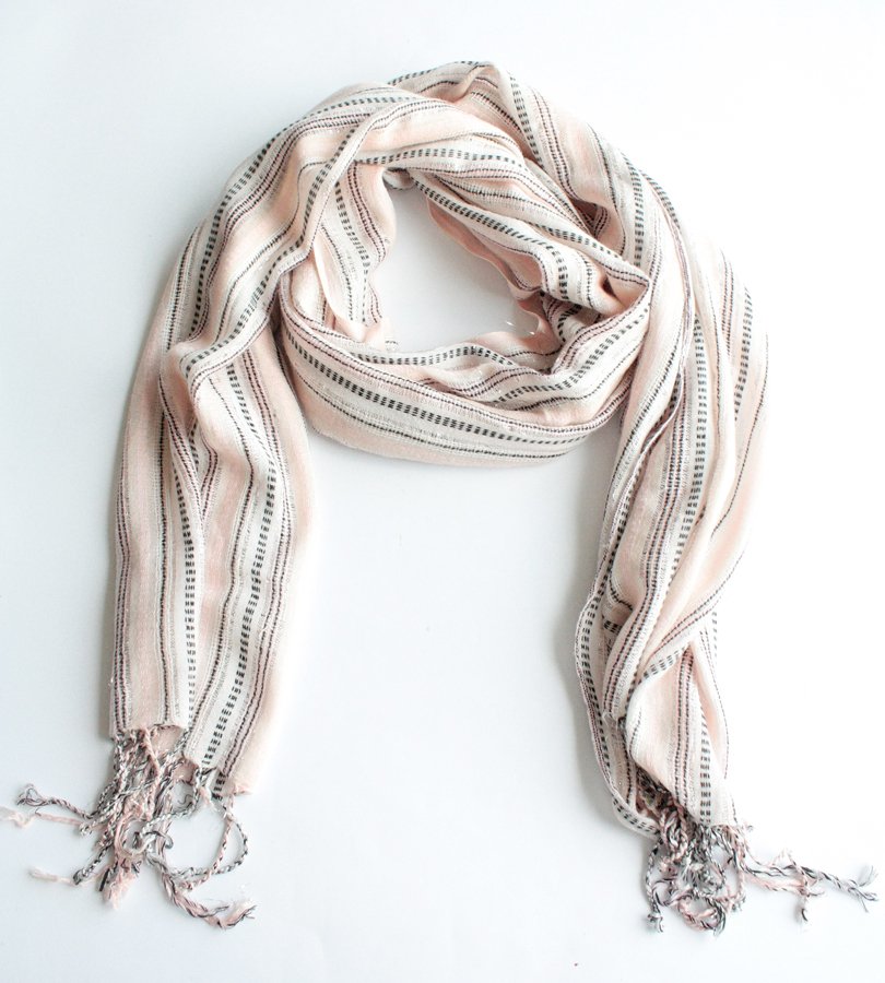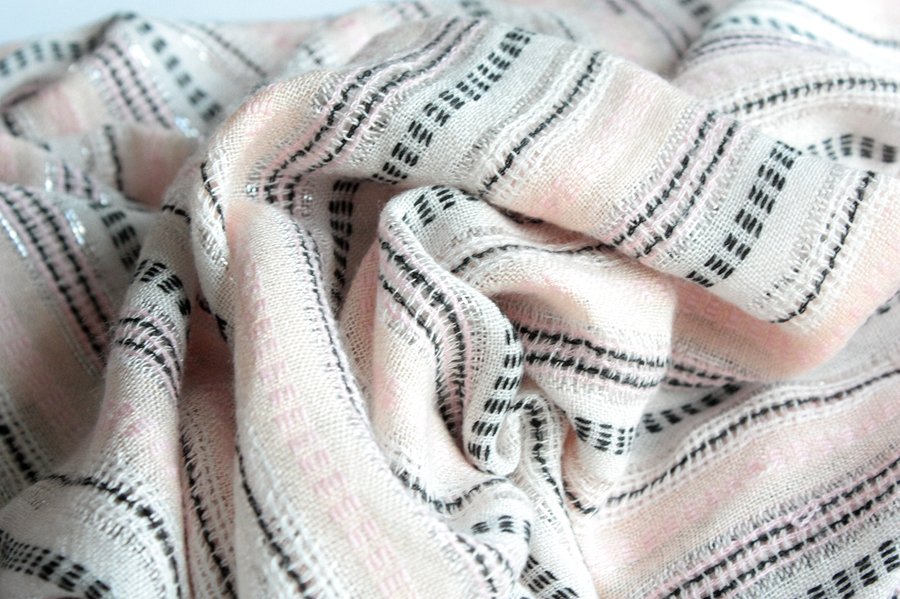Miękki, pastelowy szal przetykany subtelną, srebrną nitką. Materiał to prawdopodobnie wiskoza.
