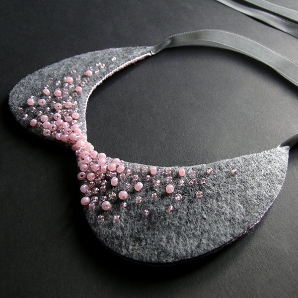 Autorski kołnierz/naszyjnik, subtelny, delikatny, jednocześnie bardzo ozdobny, wykonany ręcznie metodą haftu koralikowego - z wielką starannością. Bazę stanowi trwały filc - melanżowy szary, podszyty filcem w kolorze różowym. Wiązany za pomocą satynowej tasiemki. Polecam. Nietuzinkowy dodatek na każdą okazję.
