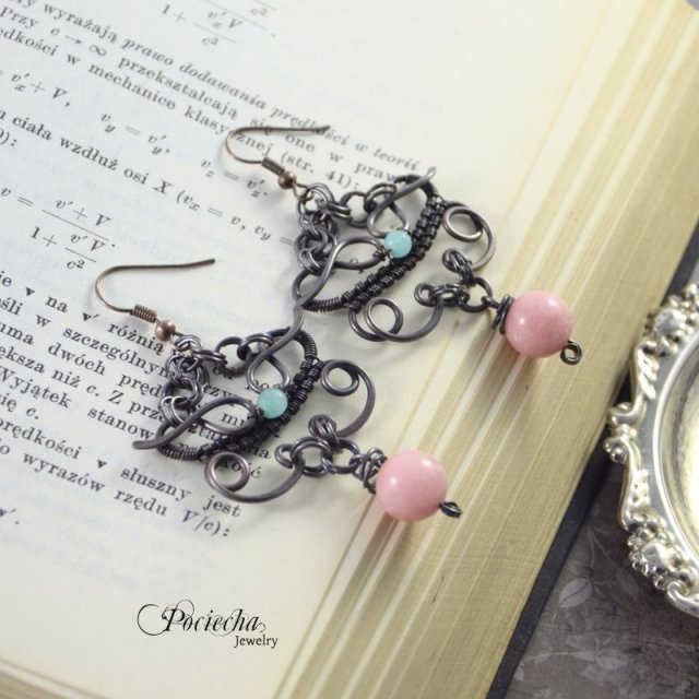 Piękne romantyczne kolczyki, stworzone od podstaw ręcznie z miedzi. Centrum kolczyków stanowią piękne jadeity w kolorach roku 2016.