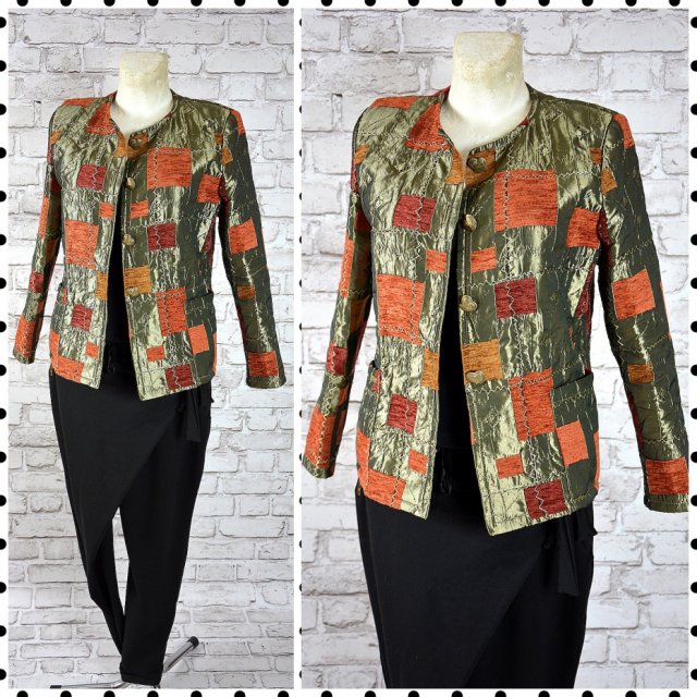 Świetna patchworkowa kurtka utrzymana w zielono -pomarańczowo- ciemnobeżowej kolorystyce, zapinana na guziki w kształcie serc, u dołu po bokach głębsze kieszenie. Elementy w zielonej kolorystyce delikatnie się mienią, reszta matowa. Wykonana z doskonale trzymającej kształt tkaniny (100 % bawełna ). Świetnie się sprawdzi również w roli żakietu.